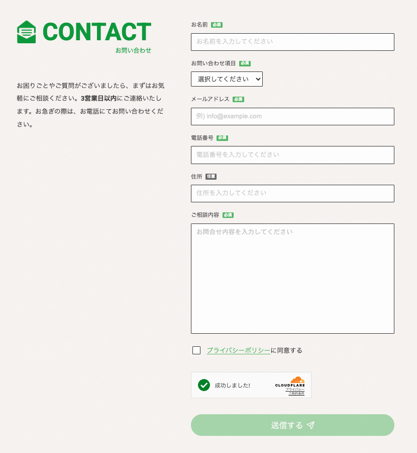 入力し直すとエラー表示が自動で消え、プライバシーポリシーへの同意を含むすべての条件を満たすと送信ボタンが有効化される仕組みです。