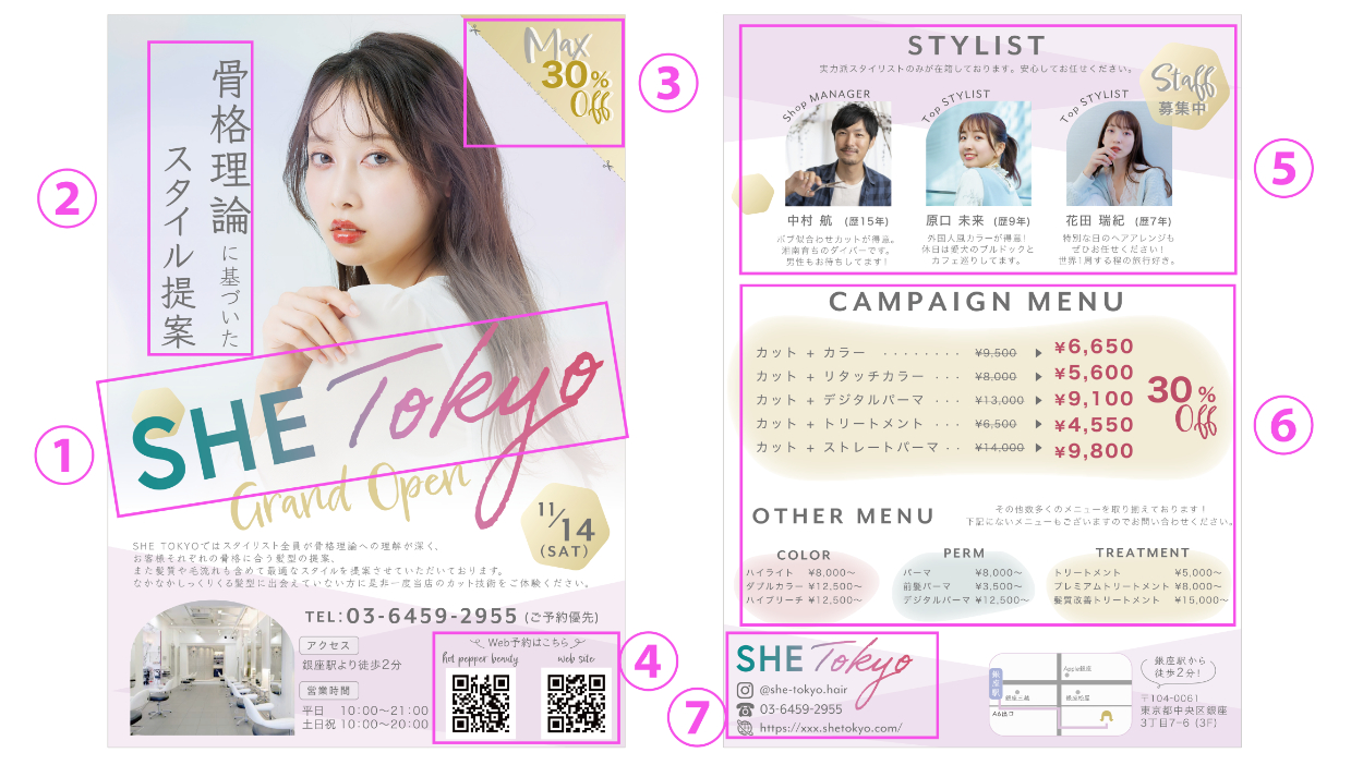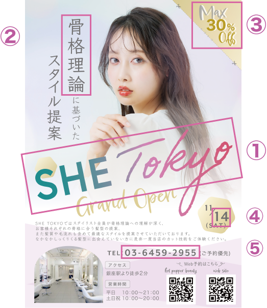 1. サロン名 → 2. 特徴&売りポイント → 3. 割引金額 → 4. オープン日 → 5. 予約TEL