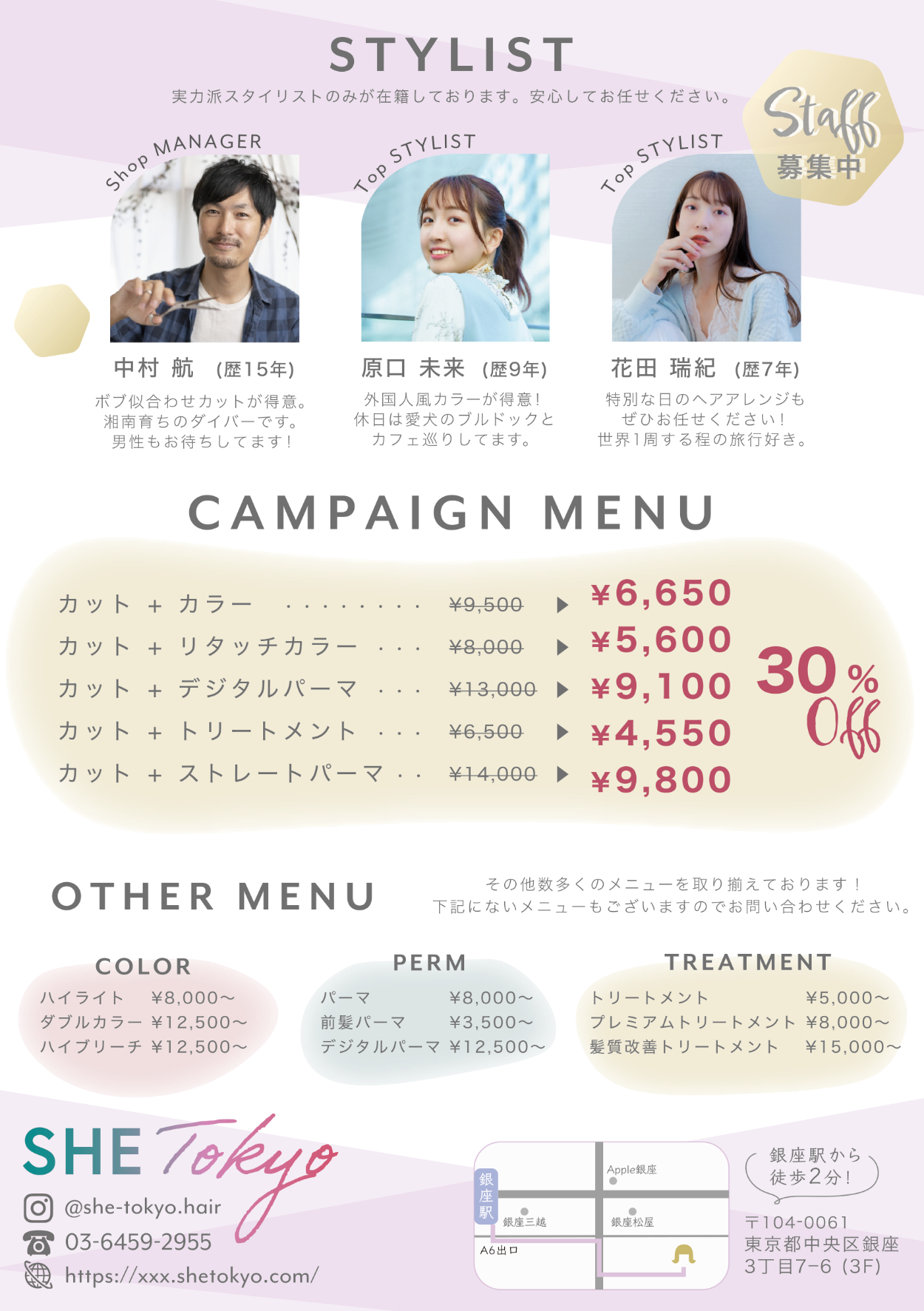 新規ヘアサロンがオープンし、認知拡大・顧客獲得のためのポストインチラシ制作しました。 【SHElikes MULTI CREATOR COURSE 課題】