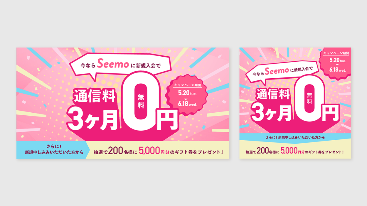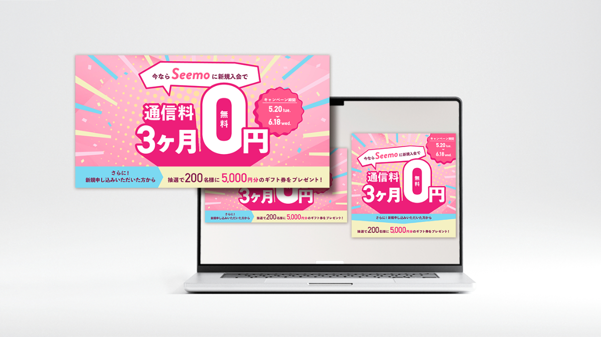 格安SIM業者(MVNO業者)Seemoの新規入会キャンペーンのバナーを制作しました。(キャリアスクールSHElikesのデザインプログラム課題制作案件)