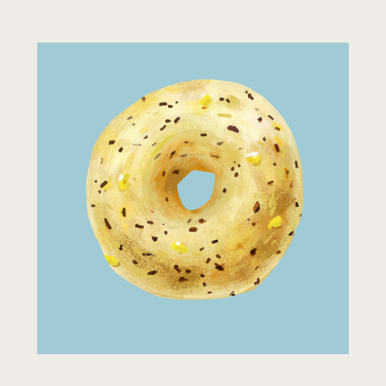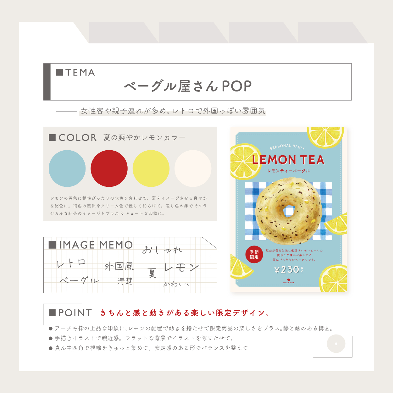 【自主制作】ベーグル屋さんPOP(イラスト&デザイン) KEIKO UEDA デザイナー/イラストレーター OVERVIEW 2024.7.23/制作時間:9時間/制作ツール:illustrator,adobefresco/コンセプト:爽やかでレトロ。上品なきちんと感と楽しい動きのある夏限定デザイン。 YEAR 2024