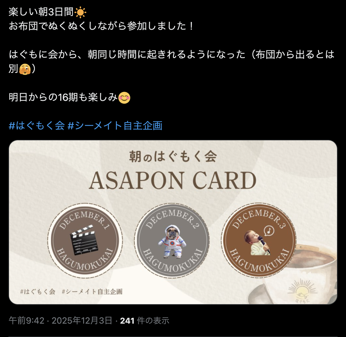 参加者からは「起きる理由があるのはありがたいです」「明日からも朝活したい」