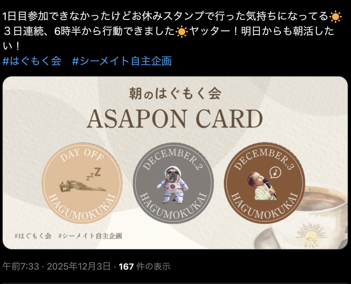 参加できない日があっても、気持ちを切らさずに次の日へつなげられるよう、再び朝活に戻るきっかけとして用意しました。