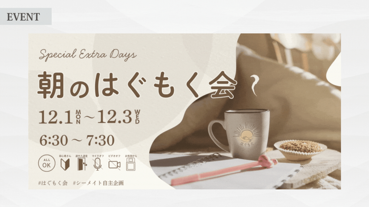 運営サポートをしている朝活コミュニティで定常開催されていた「朝のもくもく会」が、 一時的に開催されない期間が生まれたことをきっかけに、3日間限定でオンラインの朝もくもく会を個人的に開催しました。