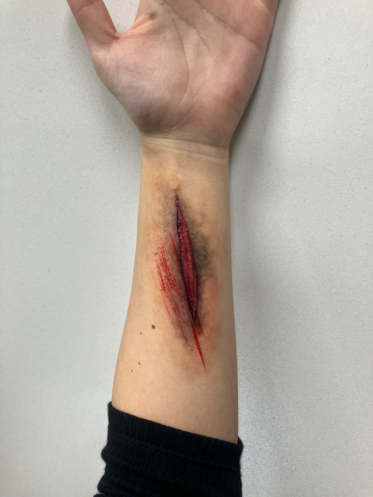 トランスファーピースを使用して火傷・傷メイクを施した。