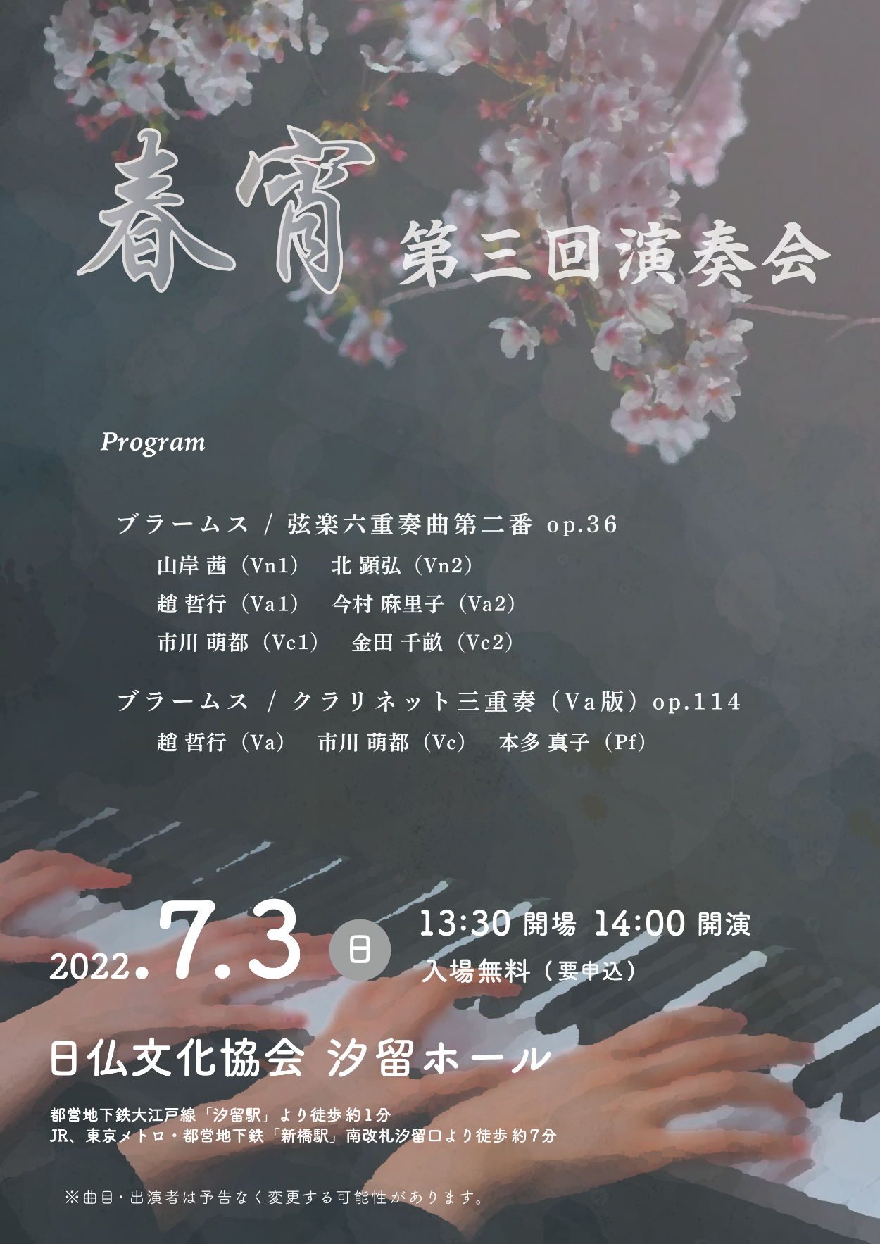 室内楽の演奏会チラシ MAKO Webデザイナー OVERVIEW 室内楽の演奏会チラシを制作しました。 YEAR 2022 ◆ 工夫したところ白黒印刷をした場合も視認性が失われないように、黒背景に白文字(またはシルバー)を選択しました。制作に伴い、提供いただいた2つの写真が違和感なく繋がるよう、フィルター機能やブラシ機能を利用しました。