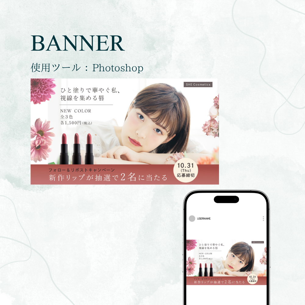 ・ターゲットが20〜30代女性ということで、若々しさ・大人っぽさを両方出せるバナーに仕上がるよう心がけました。全体的にくすみカラーを使用する・サイドの花の写真は不透明度を下げて柔らかい印象にしました。