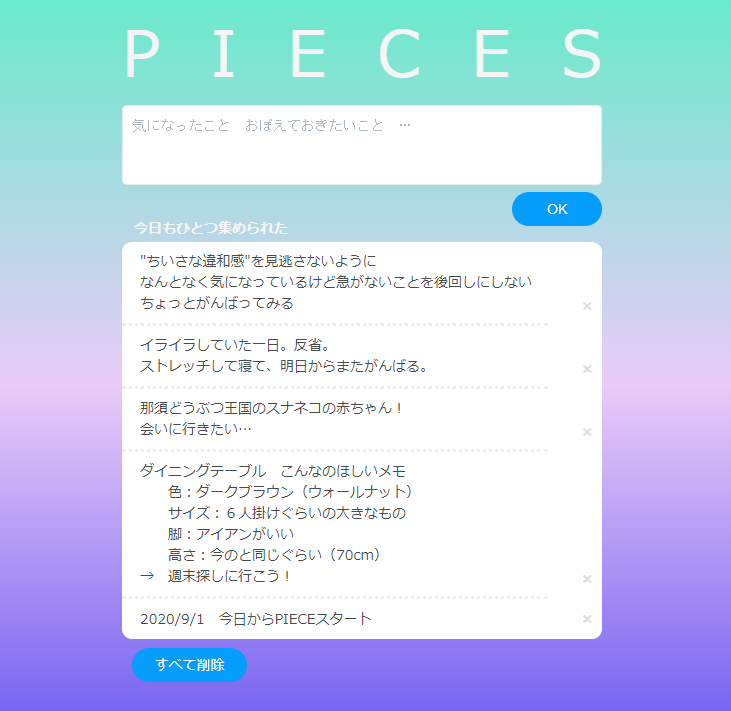 自分だけのメモを書き残せるページ/ N予備校『動くWebページコンテスト2020夏』で健闘賞をいただきました https://rapidrabbit20200814.github.io/PIECES/