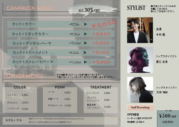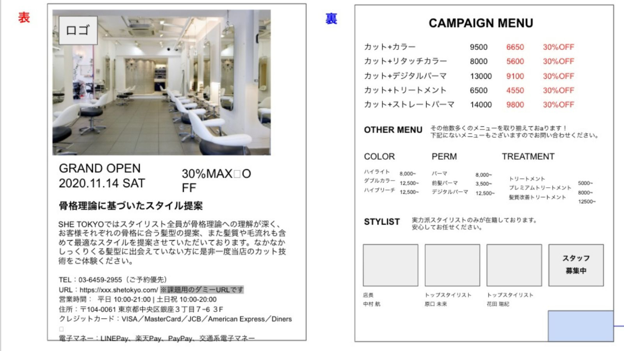 架空のクライアント様からの依頼という設定で美容室のオープニングキャンペーン用のフライヤーを制作しました