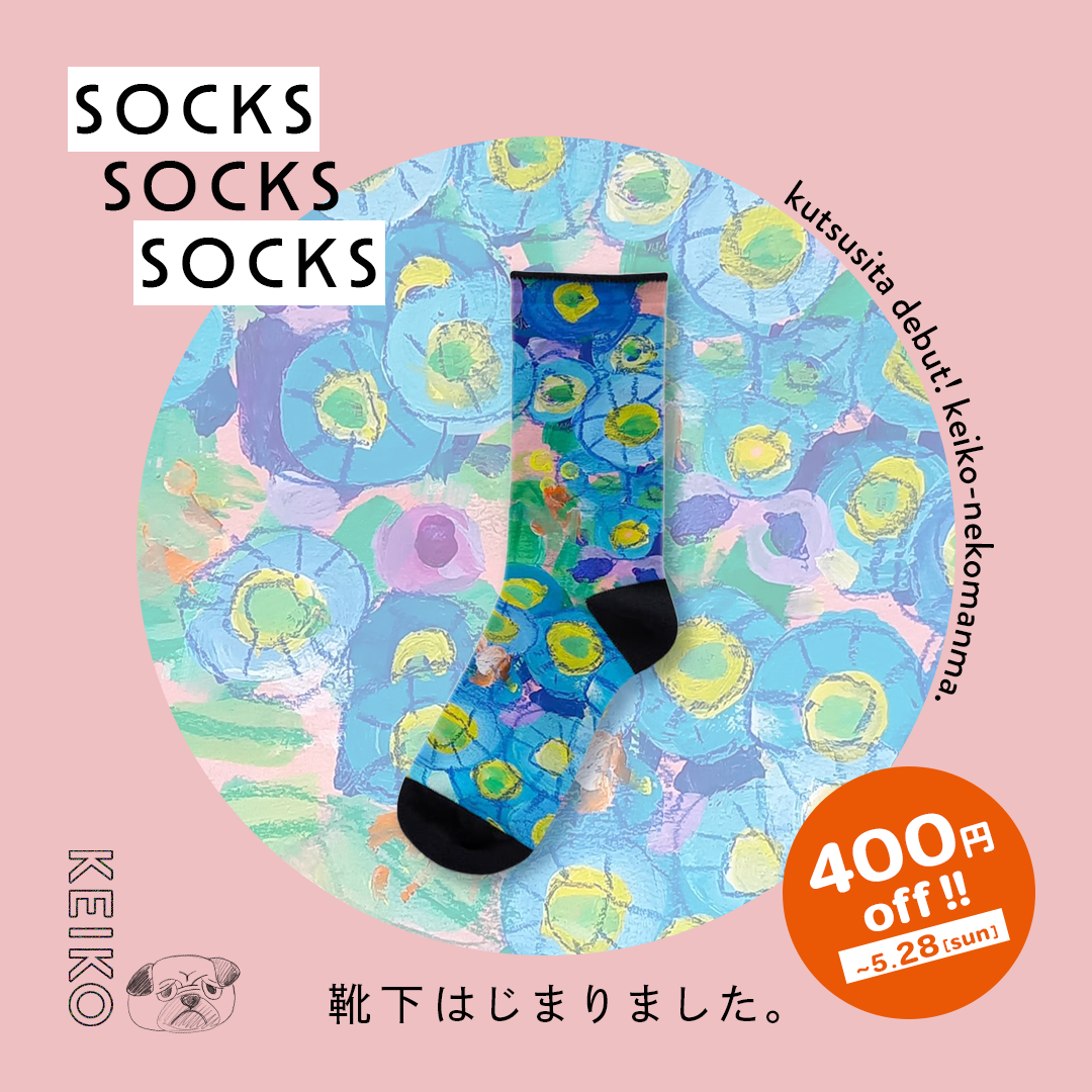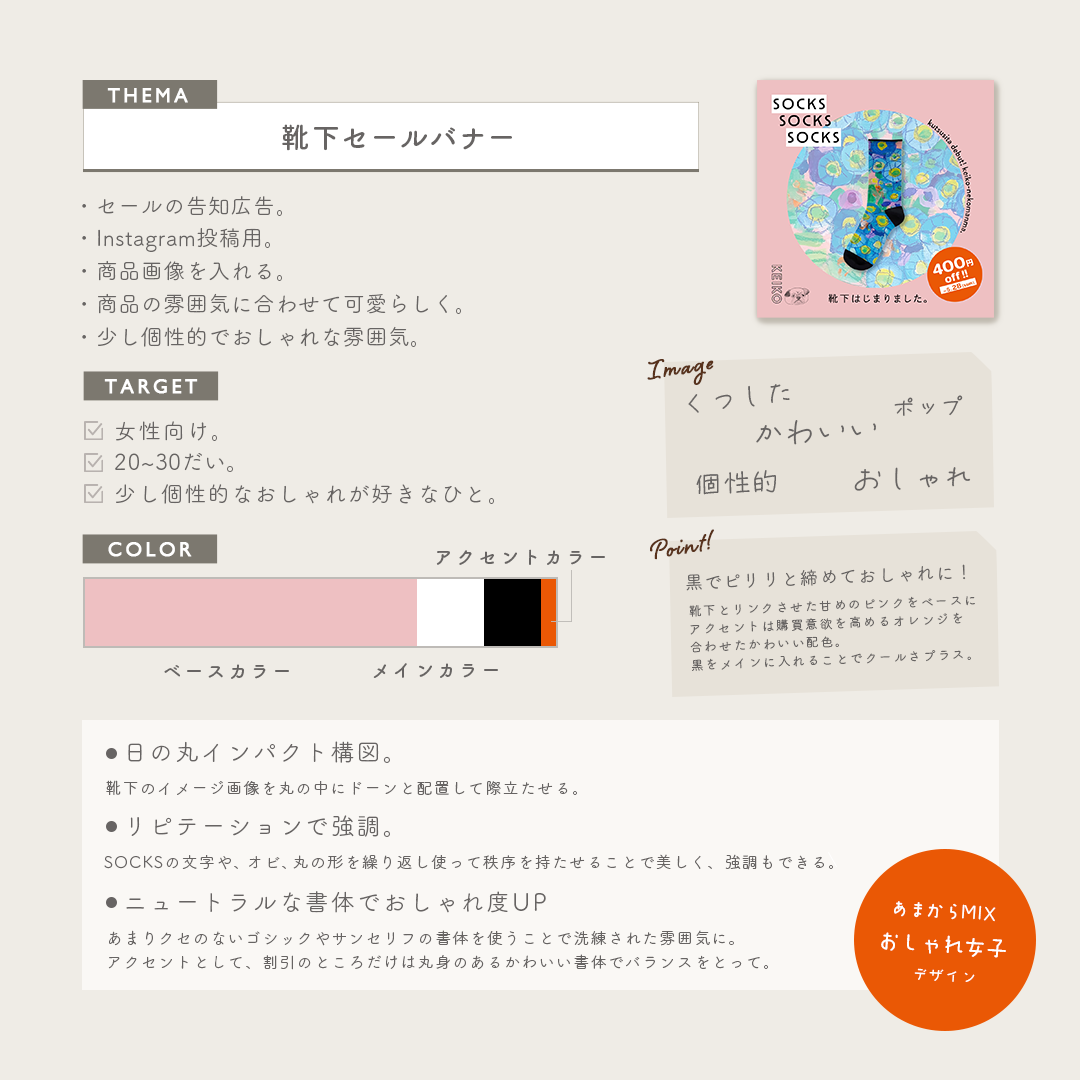 【自主制作】靴下セールバナー KEIKO UEDA デザイナー/イラストレーター OVERVIEW 2024.6.18/制作時間:3時間/制作ツール:Photoshop/コンセプト:おしゃれでカワイイ甘辛MIXデザイン YEAR 2024