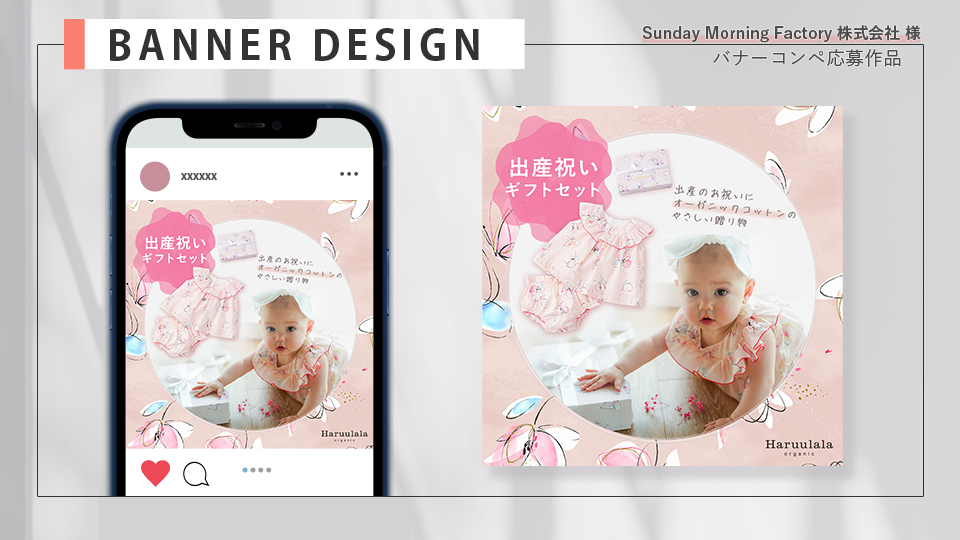 出産祝いのギフトとして展開されているオーガニックベビー服ブランド”Haruulala”の広告バナーコンペの参加作品として制作しました。