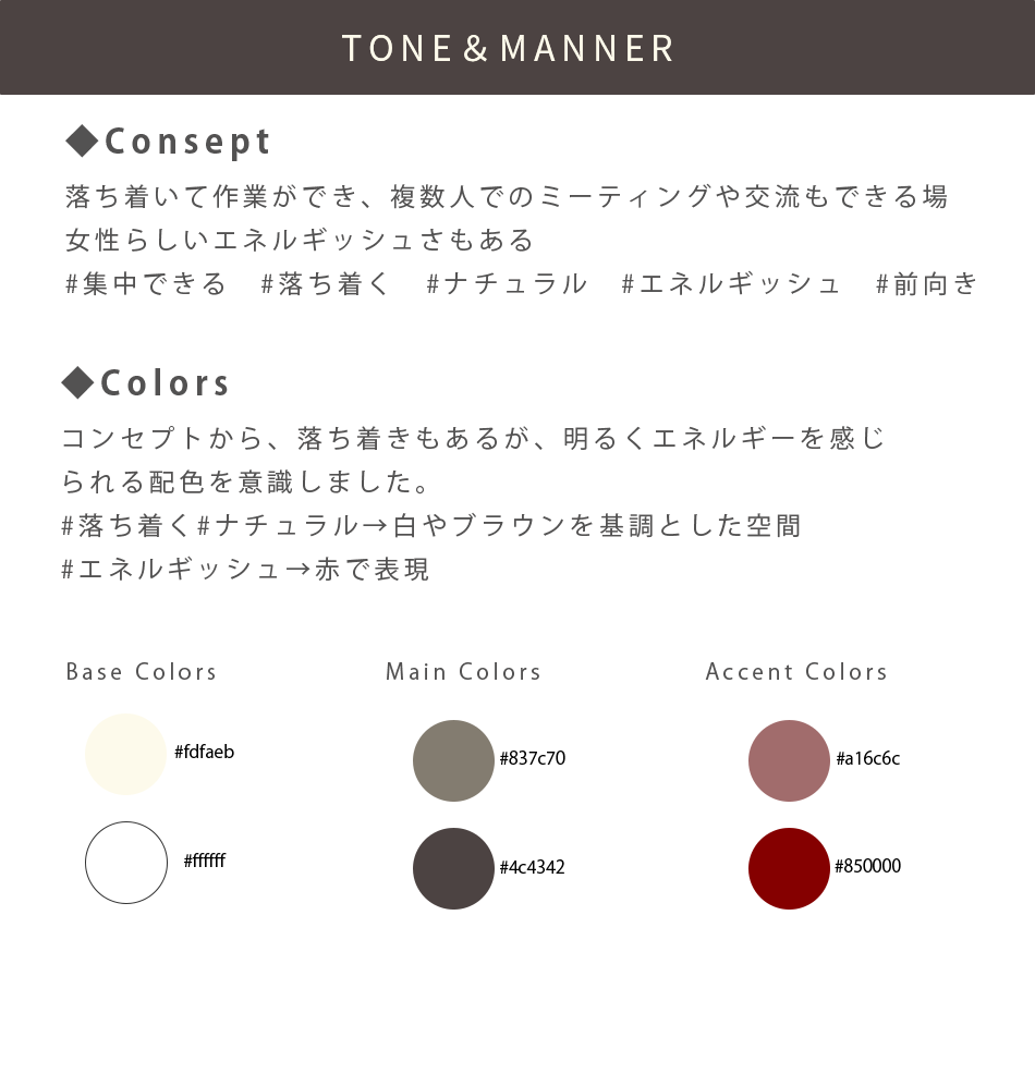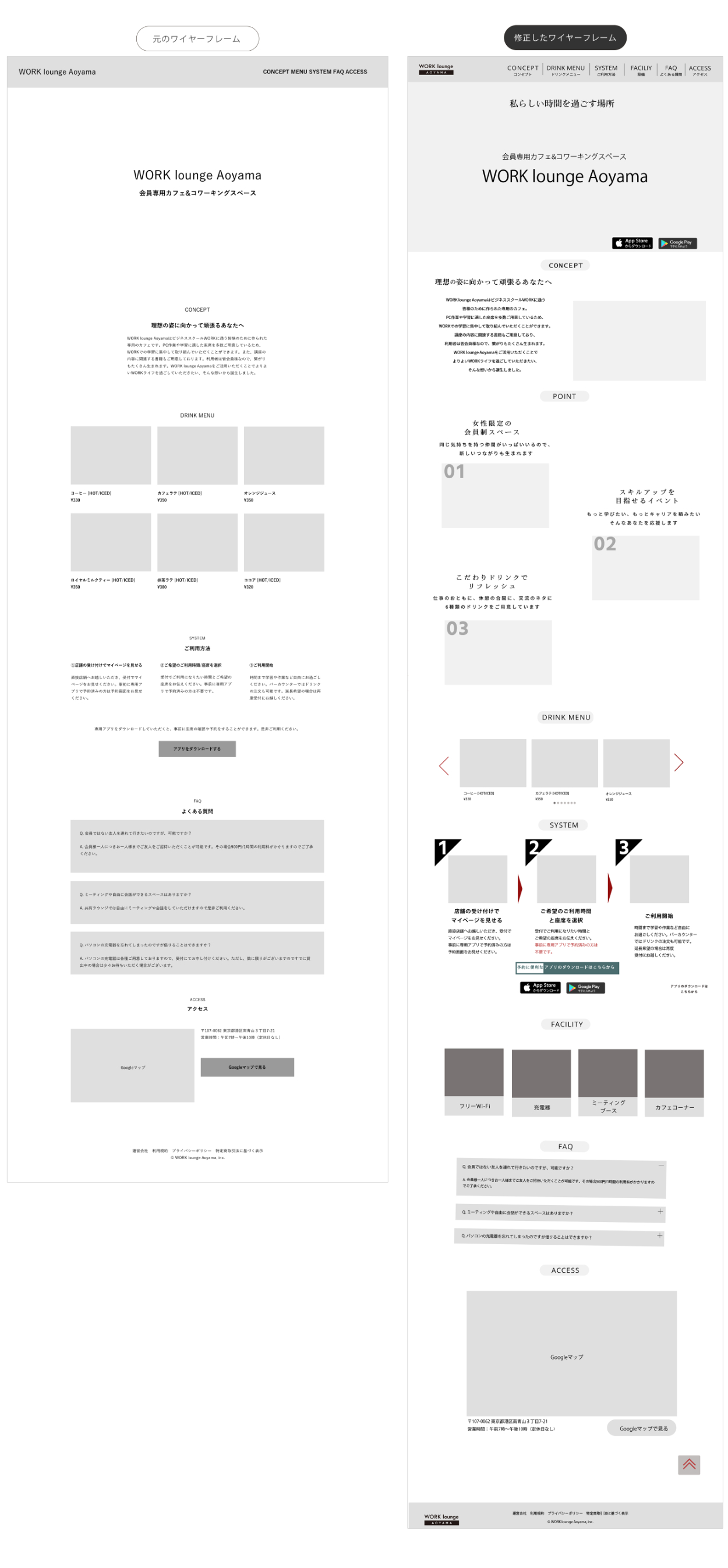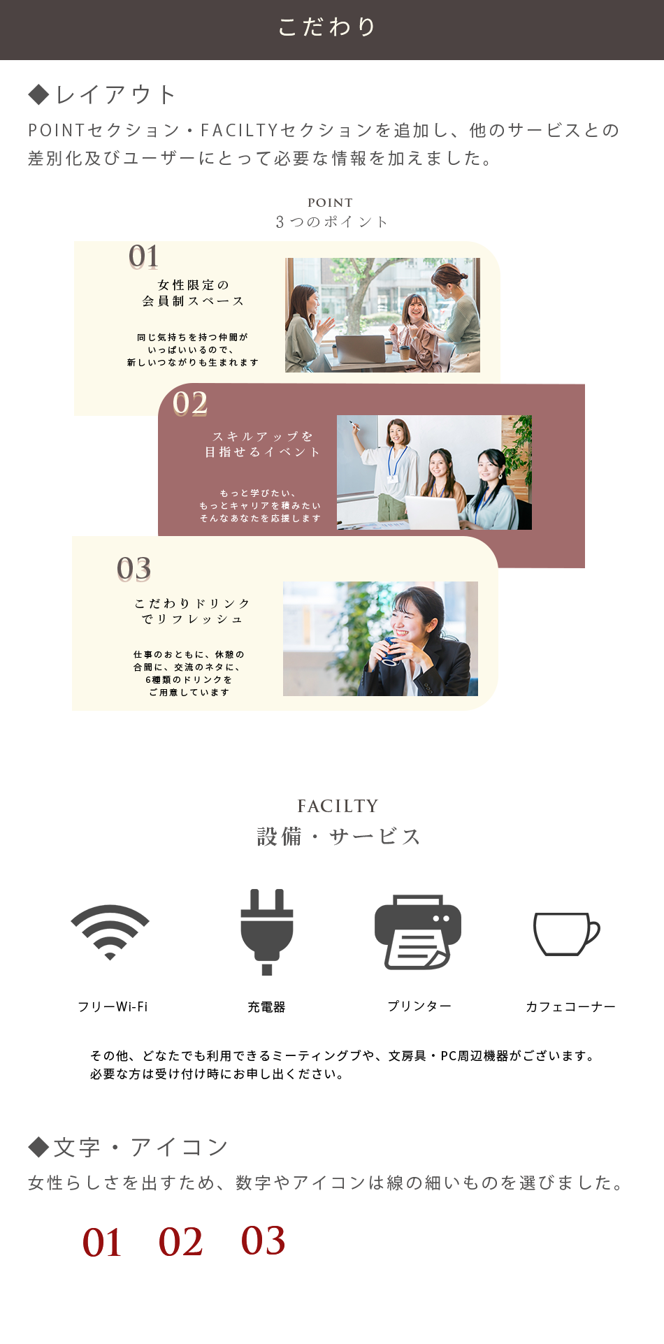 女性がターゲットのため、全体的に柔らかい印象になるよう線の太さを細くしたり、アイコンも線の細いものを使用したりなど、細部までペルソナを意識するようにしました。また目的(WORK rounge Aoyamaについて知ってもらう)からゴールを設定し、必要な要素を追加・提案するスキルを学びました。