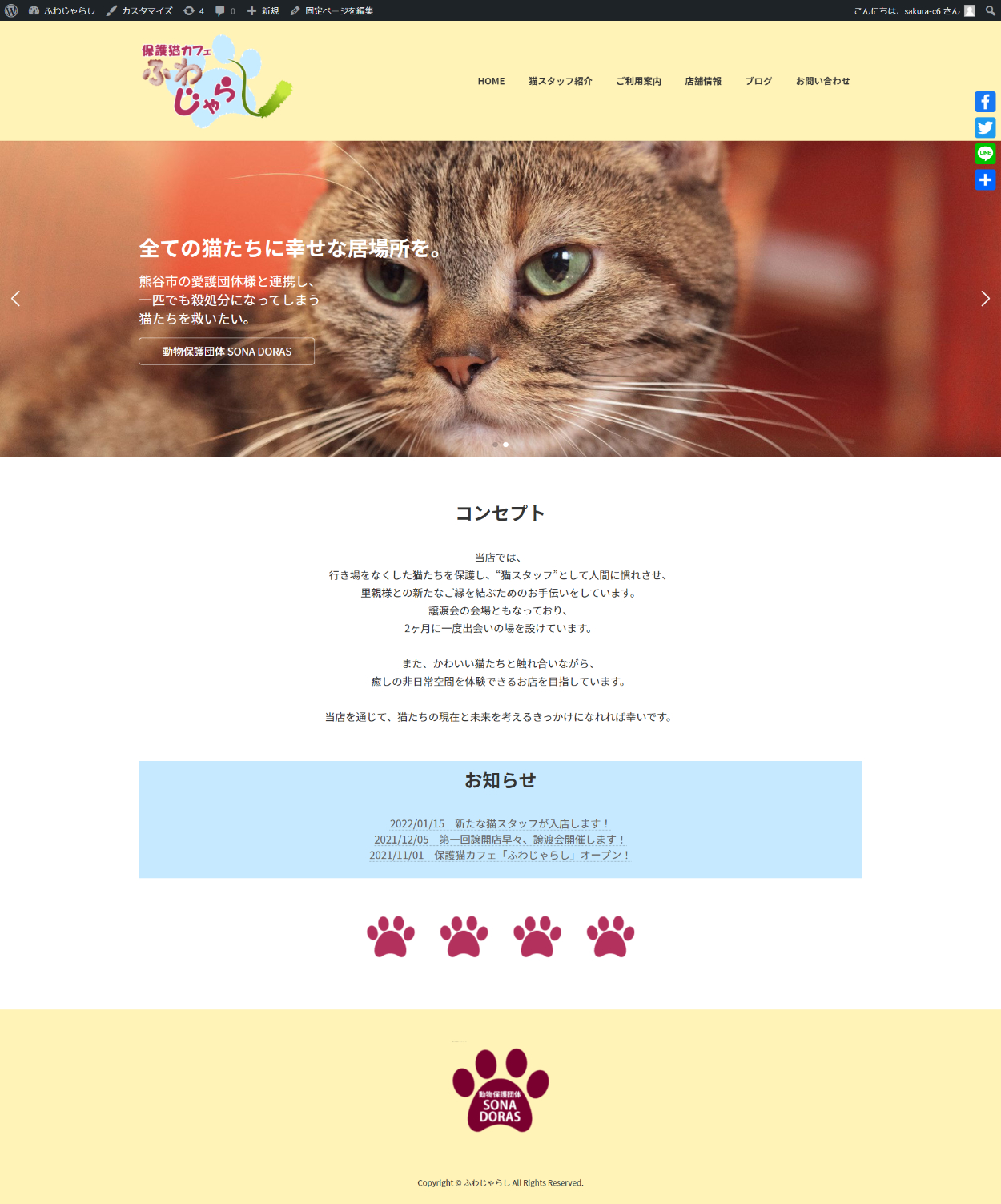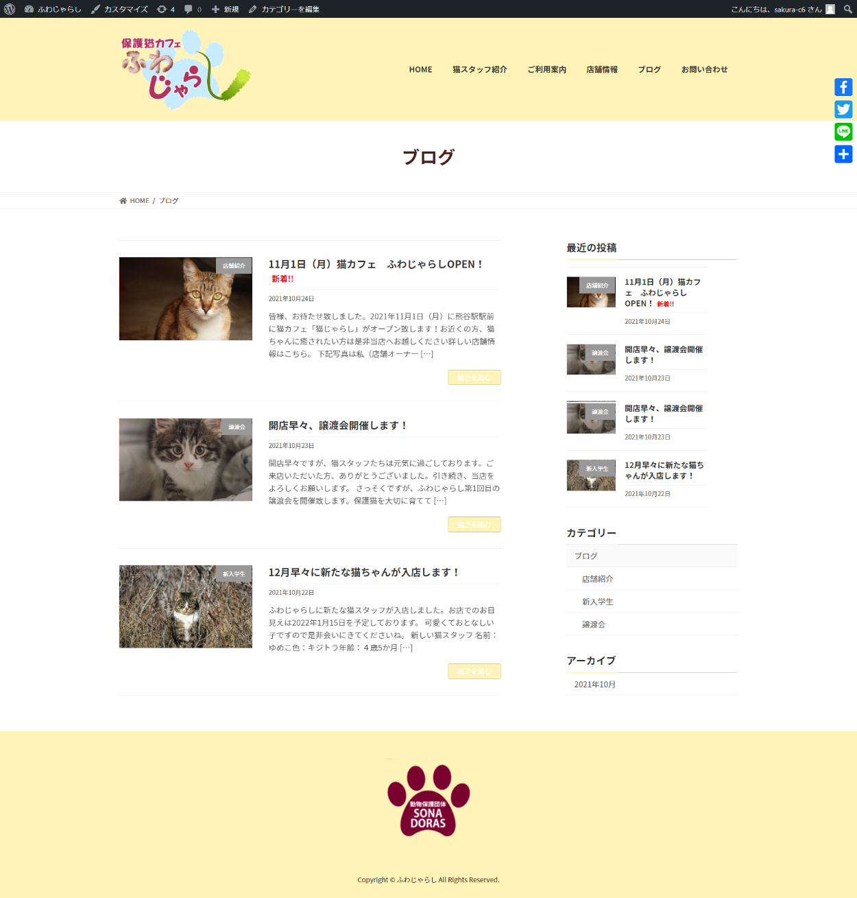 タイトル:保護猫カフェ「ふわじゃらし」 ブログページ作成(個人担当ページ)