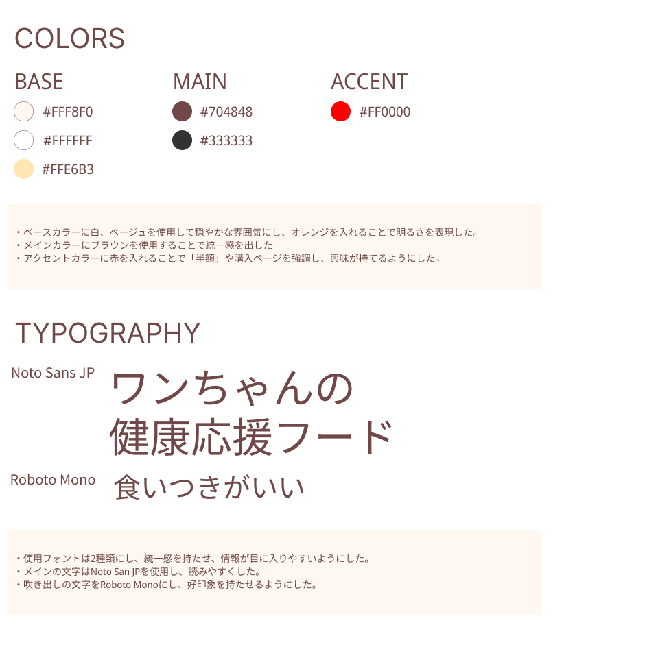 Hertechの課題でドッグフードのLP制作に取り組みました。架空のクライアントからの依頼を下に、ワイヤーフレームの設計、デザインカンプの制作を行いました。