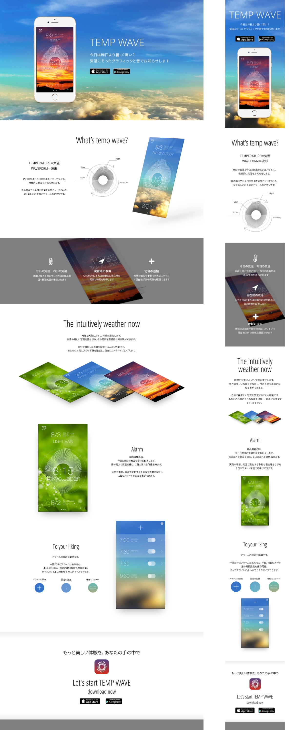 1ページサイトの制作課題、PC版とSP版を指示書通りにデザイン。