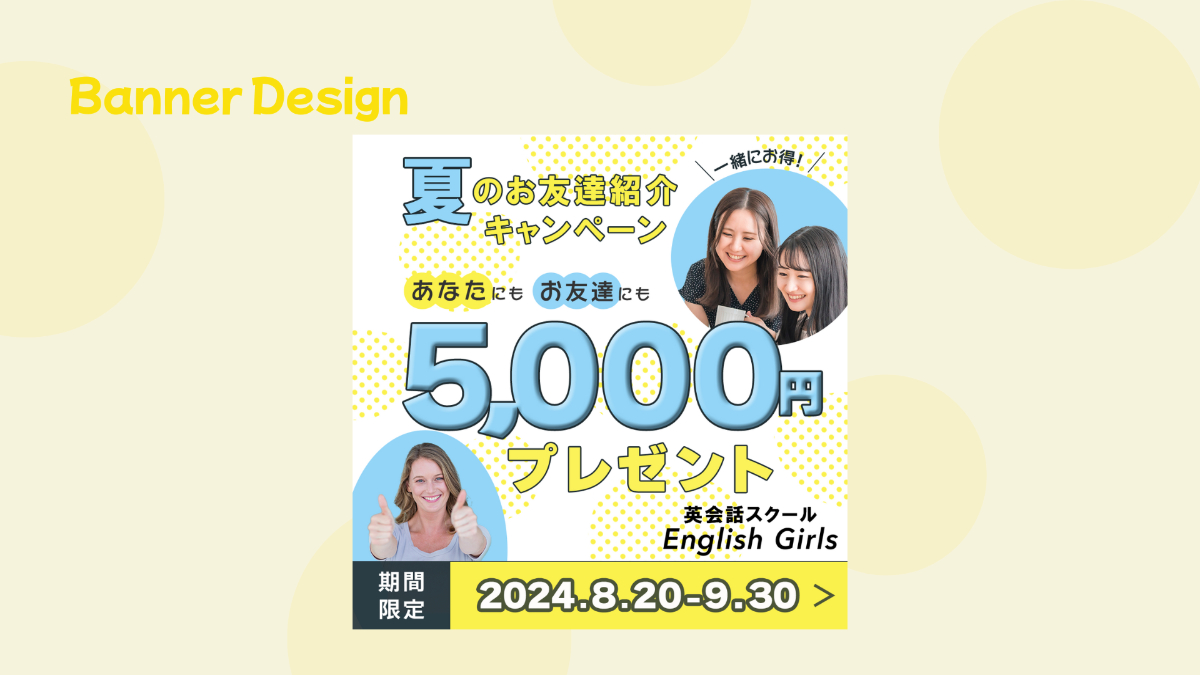 SHElikes PROデザイナーの課題にて初めて作成したバナーです。20代女性向けの英会話スクールの入会者を増やす目的として作成いたしました。(制作時間:5日間)