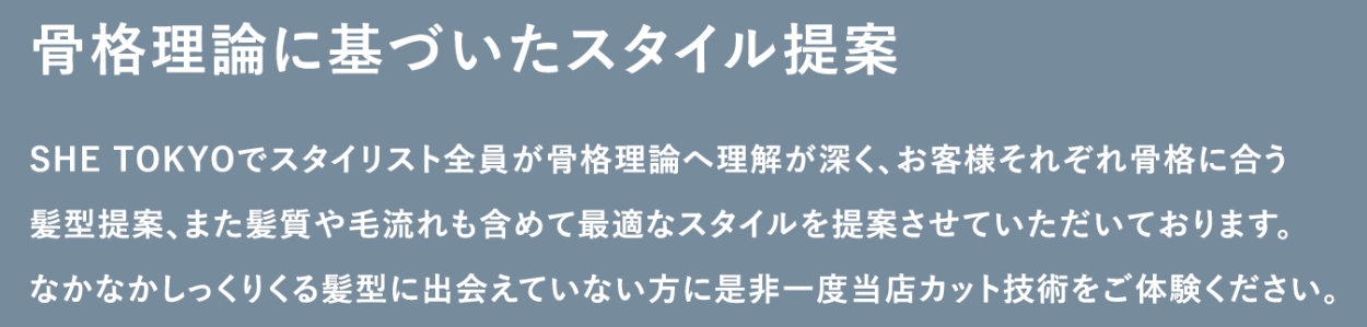 銀座に拠点を構える、骨格理論に基づいたスタイル提案が売りの美容室。一人ひとりの骨格や髪質に合わせて最大限に合うように仕上げることが得意。スタイリストはモデル御用達の有名店で腕を磨いた実力派。