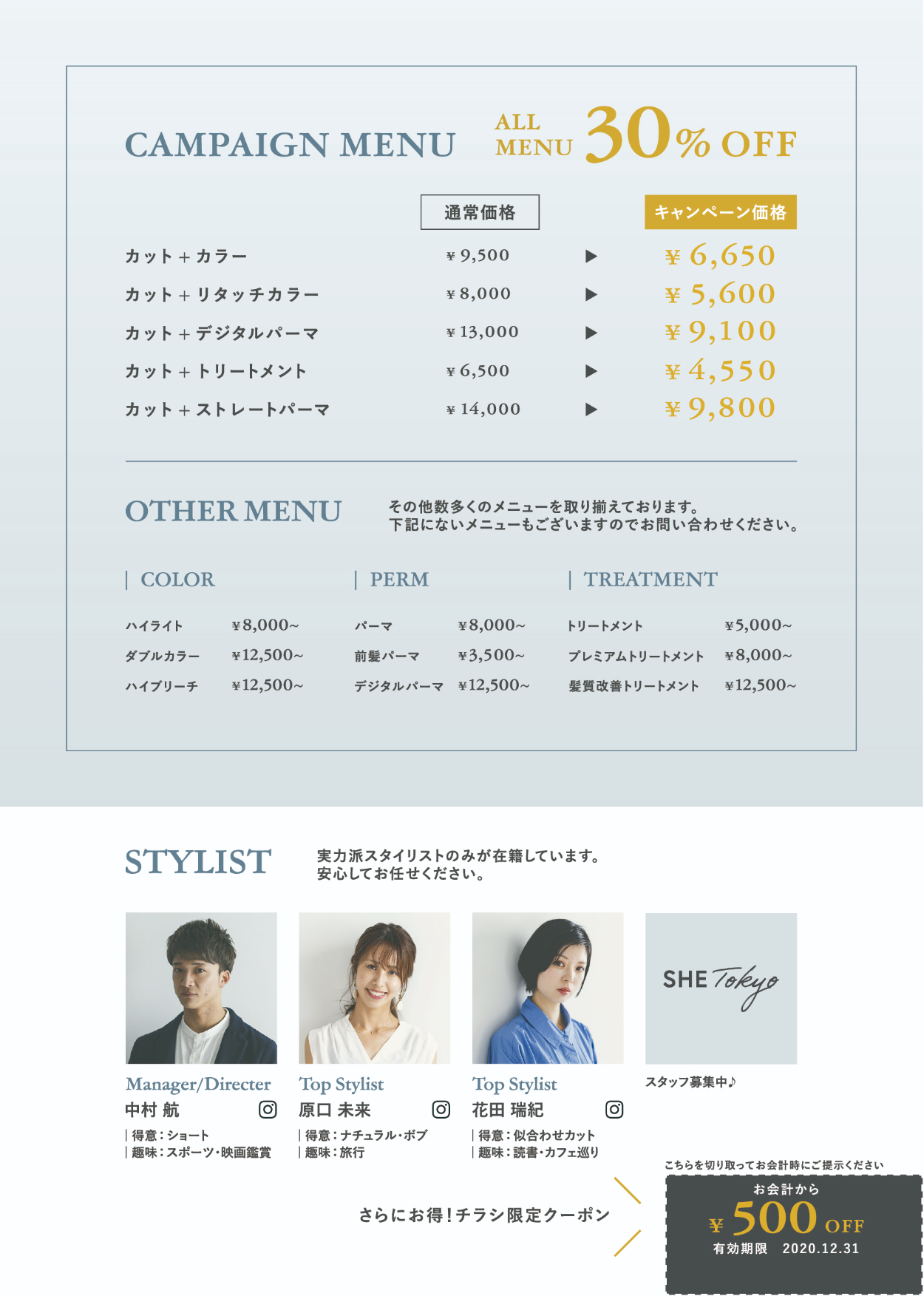 ■架空クライアントからの依頼:美容室をオープンすることになり、特別キャンペーンを実施するため、ポスティング用のフライヤー作成をしてほしい。