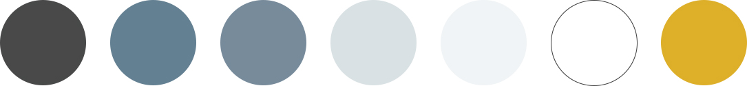 「銀座にオープンする、芸能人御用達の店舗で実力を磨いたスタイリストのいる美容室」ということと、考えた上記のペルソナを元に、「シンプル・洗練・落ち着いた」といったワードをイメージし、グレー・ブルーグレー・ホワイトを使用した。また、そのイメージに「銀座の高級感」をプラスできるかつブルーの補色にあたる、イエローゴールドをアクセントカラーとして使用しました。