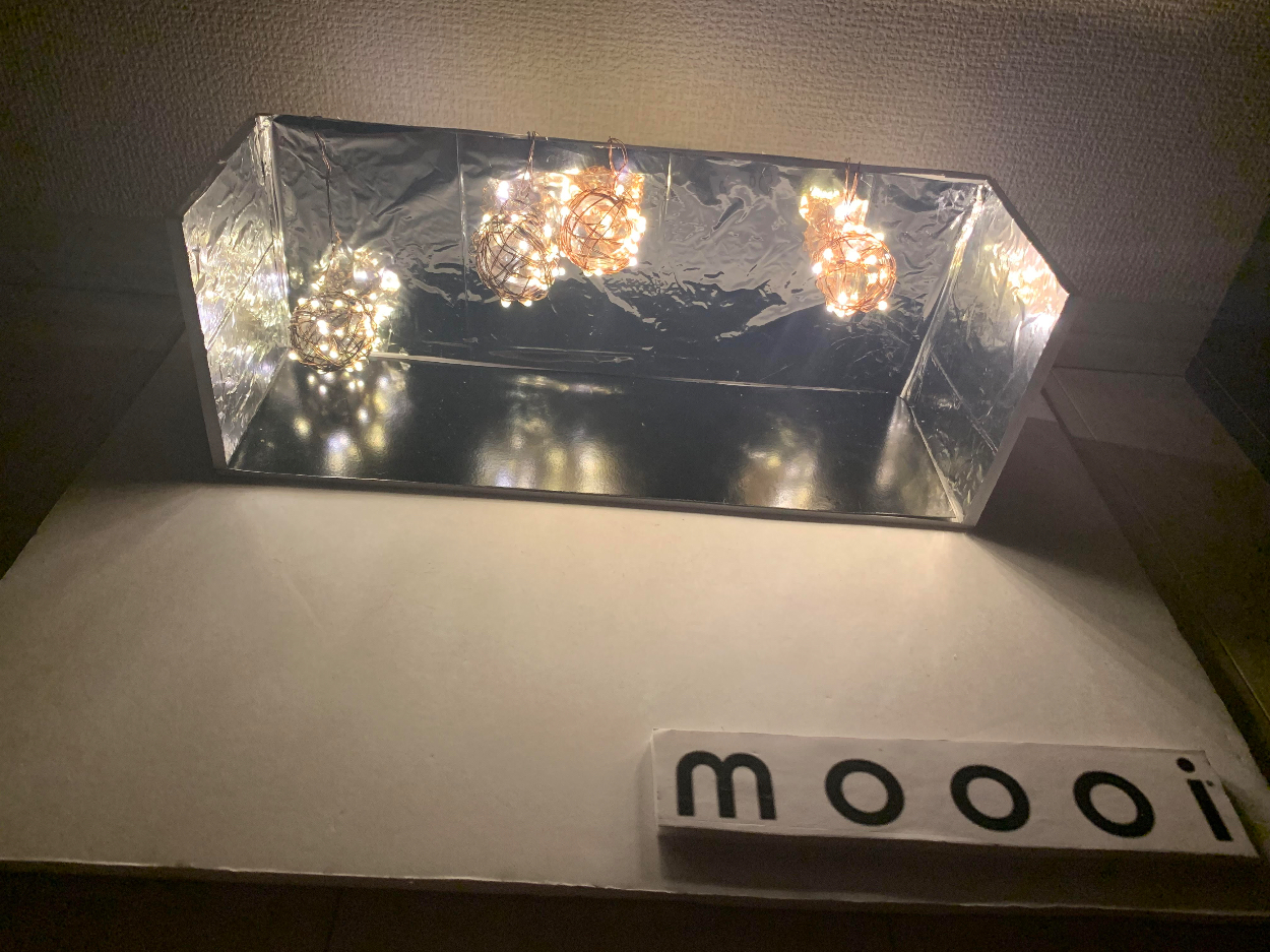 ▼最大の特徴を活かすためにはシンプルに仕上げる事が大事だと思い、周りを全て鏡張りにし、足元を黒くし電球自体を光らせました。それにより、実際に宇宙かと錯覚させるような奥行きや鏡に写ったRaimondを楽しむ事ができ、足元の暗さから浮遊感をも醸し出して見る人の想像を駆り立てるような体験型になっています。
