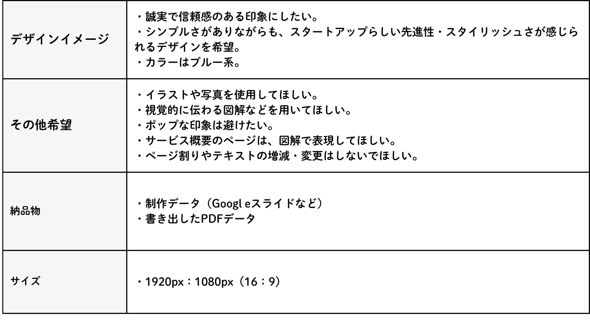 プレゼンテーション用だけでなく、印刷して事前配布できる資料として設計すること。