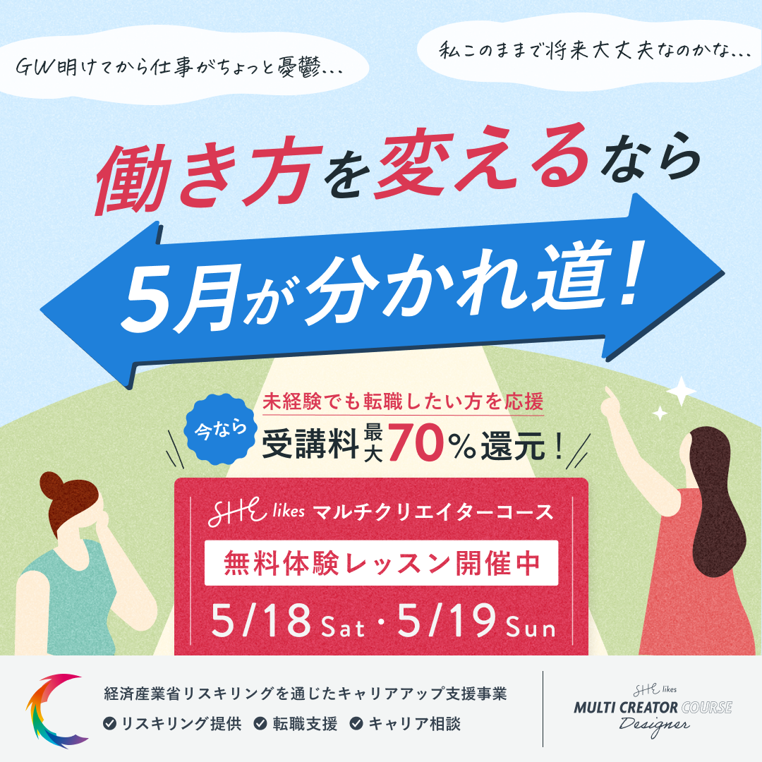 SHE株式会社様が運営する女性向けキャリアスクール「SHElikes」マルチクリエイターコースの無料体験レッスンへの誘導を目的としたSNS広告バナーを制作しました。 使用ツール:Figma/制作時期:2024年5月