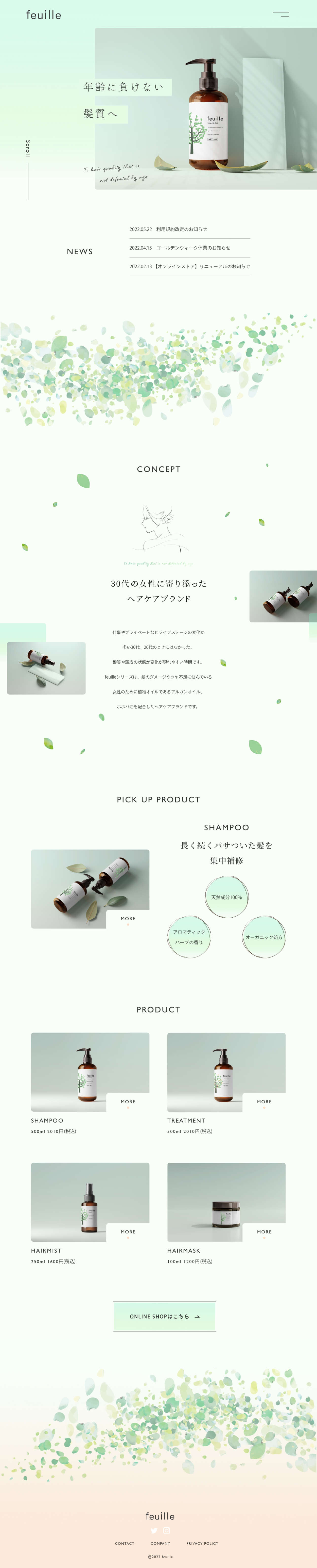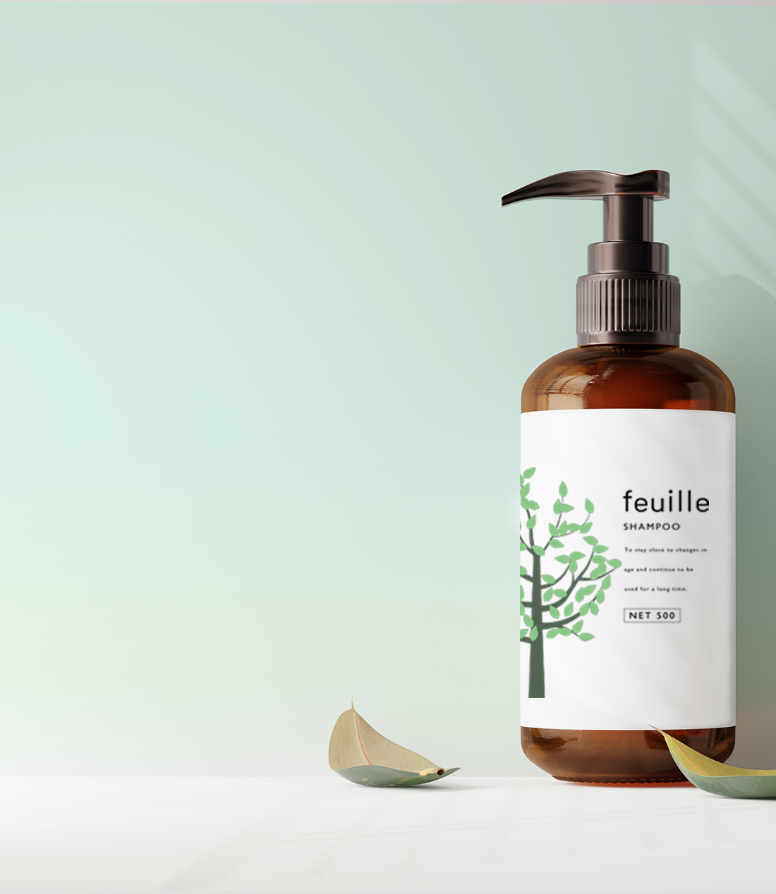 ・ブランド名であるfeuille (葉)からパッケージデザインを考えました。木のように長く使い続けられるヘアブランドになって欲しいという意味が込められています。ターゲットに合わせて、上品かつシンプルなデザインに仕上げました。