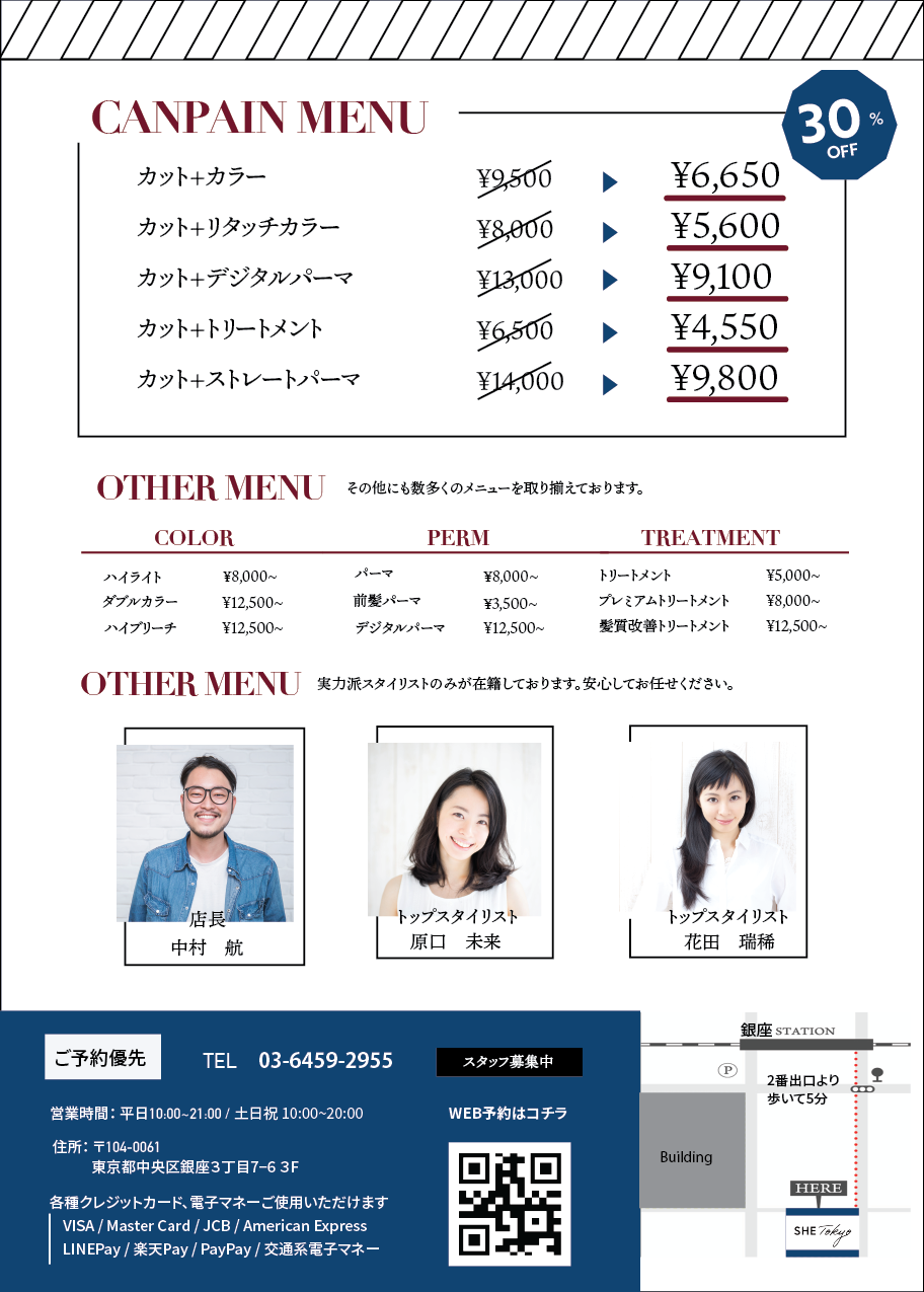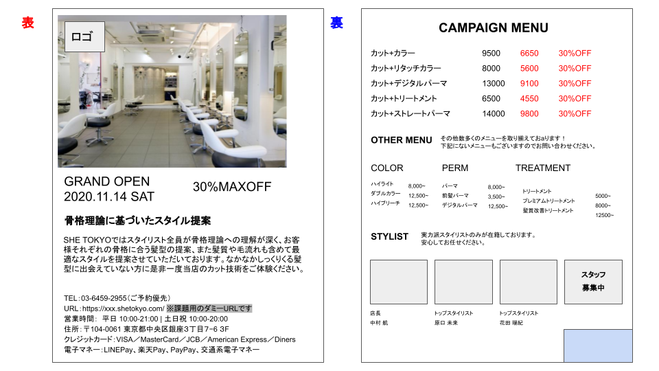 SHE likes MULTI CREATER COURSE 7つ目の課題です。架空美容院のフライヤーを制作しました。(制作時間 15時間)