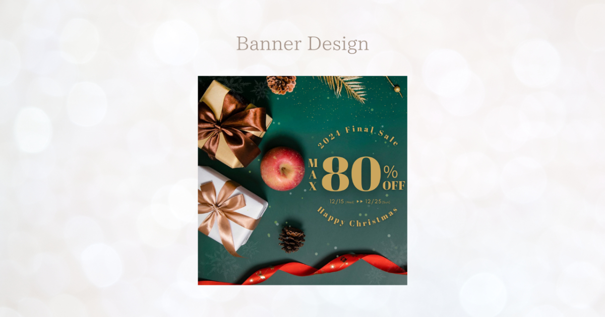 【自主制作】SNS広告バナー 瀬山紅音 Webデザイナー OVERVIEW 架空のショッピングモールで行われるセールイベントのバナーを制作をしました。 所要時間:合計約4時間使用ツール:Canva▼ ターゲット20代~50代男女ファミリー向け▼ 工夫した点ショッピングモールのセールイベントのため、幅広い層の方々が見た時にわかりやすいようにセール価格の数字を大きくし目立たせました。使用する画像やフォント、カラーはクリスマスを意識して仕上げました。