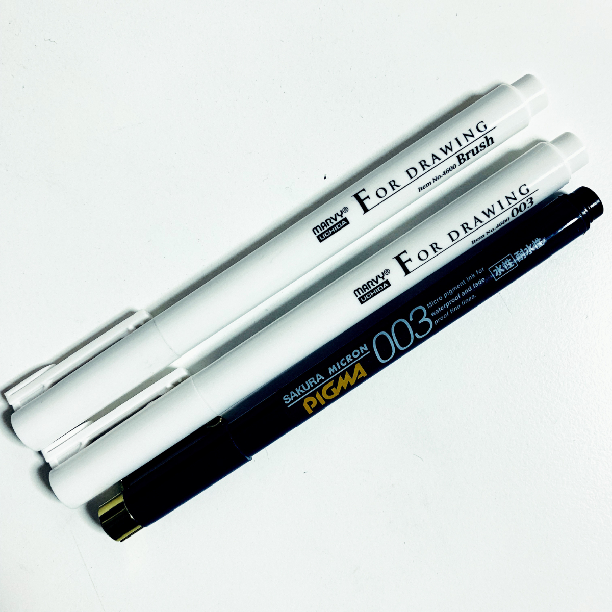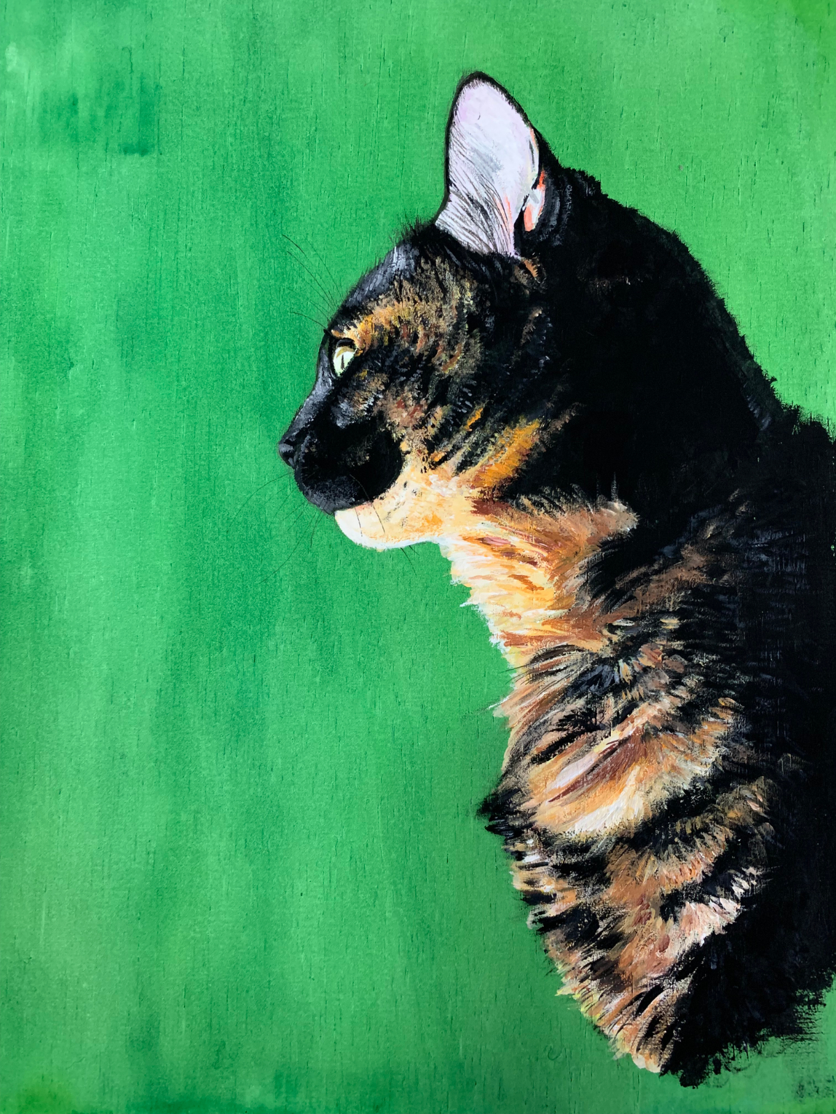 佃煮詰め合わせの桐箱の裏全面にアキーラで水彩風の背景を塗り、アクリルガッシュで彩色。ヒゲは面相筆とペンを併用。マービーのFor Drawing 003はペン先がカリッと強く、猫のヒゲを描くのに最適。ピグマはペン先がやや柔らかいので、木のような表面の乾いた凹凸にひっかかりやすい。