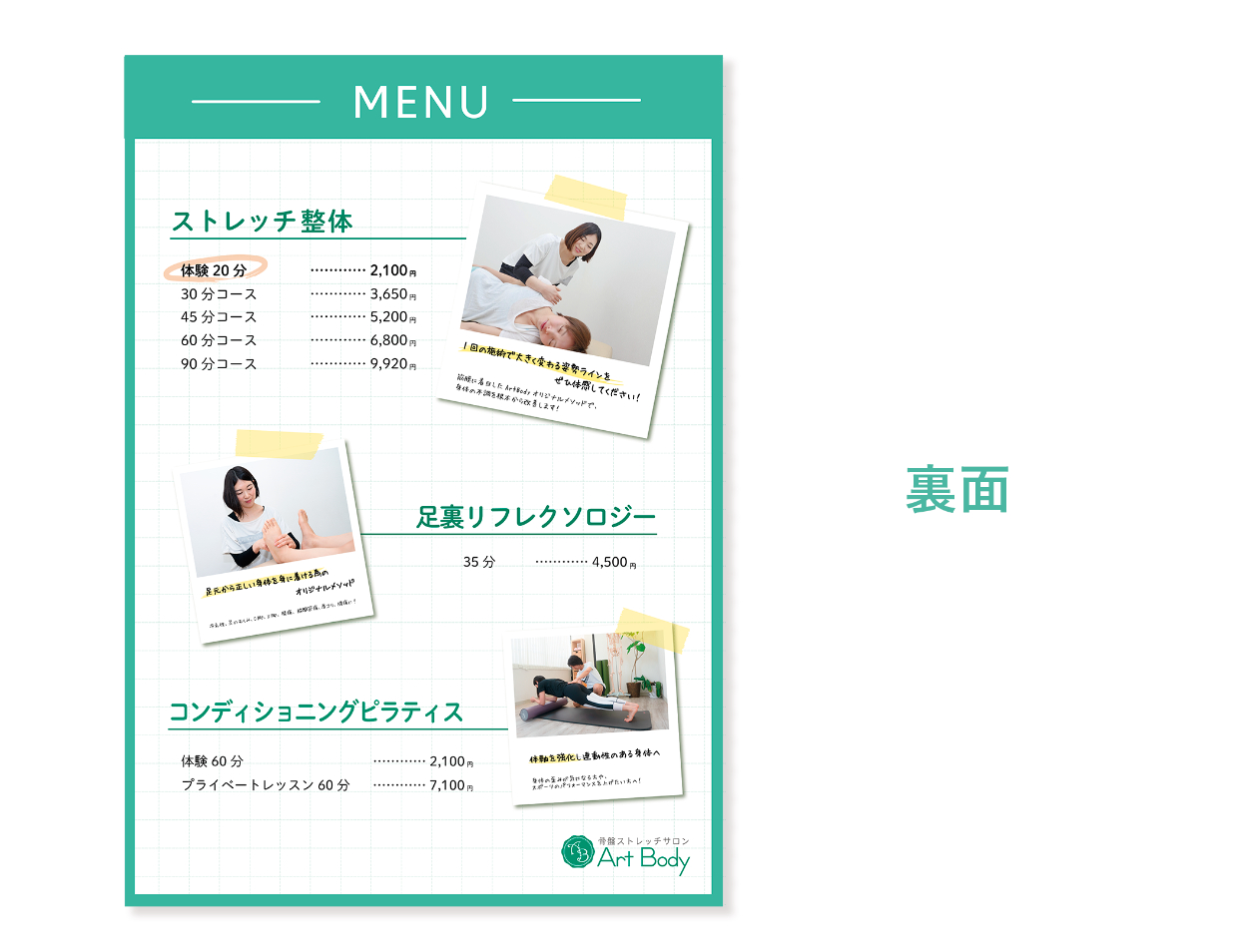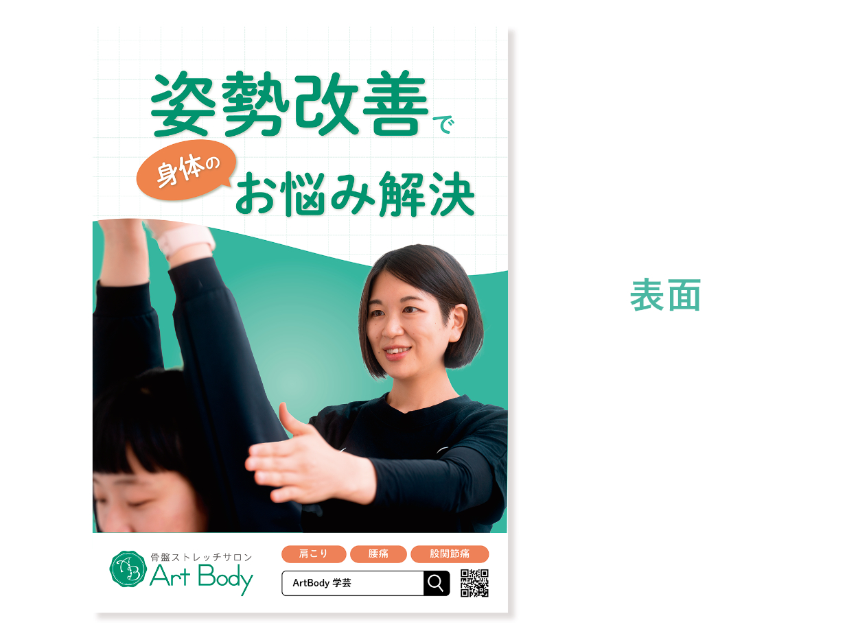ArtBody様が大切にしている、「姿勢が正しくなれば、様々な体の不調が改善できる」という思いを伝えるため、姿勢改善の部分を強調したキャッチコピーを大きく配置しました。