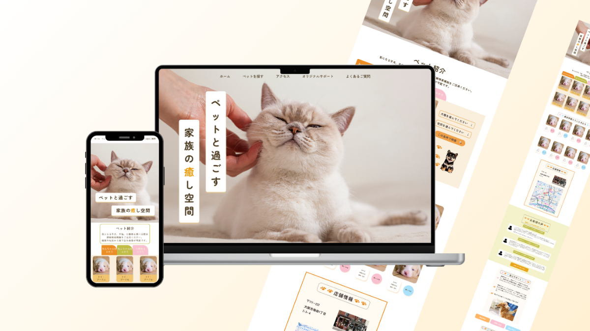 ◯デザイン:温かさや親しみやすさを持ってもらいたく、オレンジ、ブラウンの暖色を使用しました。単身の方、お子さんのいる夫婦など、どんな方でも気軽にみやすいサイトとなるよう、犬の足跡のイラストをつけました。「ペットの癒し」を表現するために飼い主に撫でられくつろいでいる猫の画像を使用しました。「お客様の声」は商品を購入する上で大切な部分になるので緑色でメリハリをつけました。