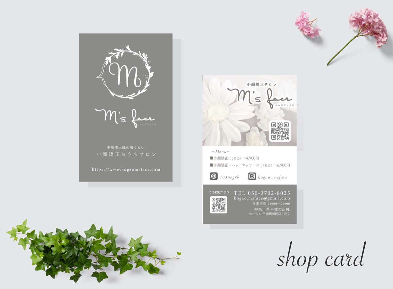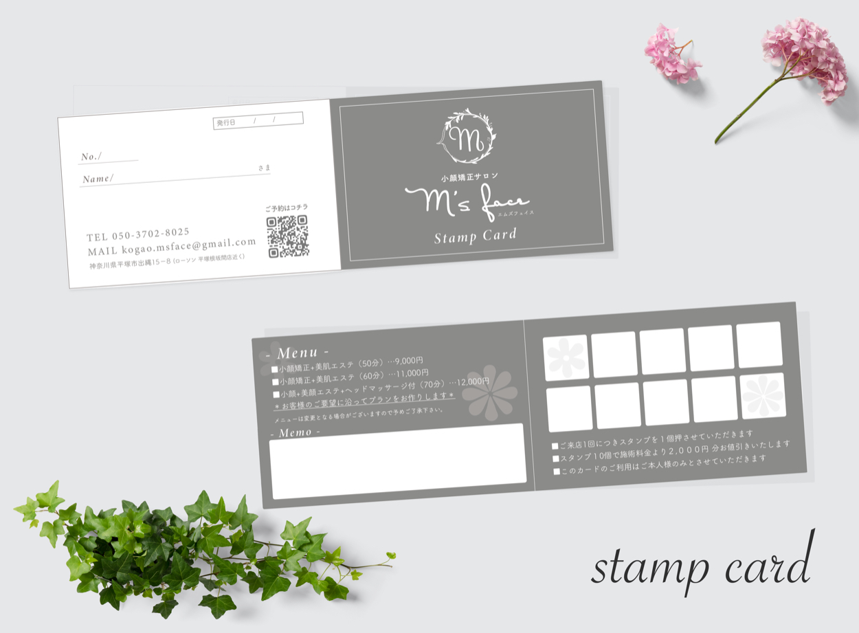 小顔矯正おうちサロン「m's face」 おのでらちほ デザイナー OVERVIEW ショップカード 、スタンプカードデザイン CL.m's face YEAR 2020 *店舗スタンプカード(見開き両面 4p)*店舗ショップカード(両面 名刺サイズ)