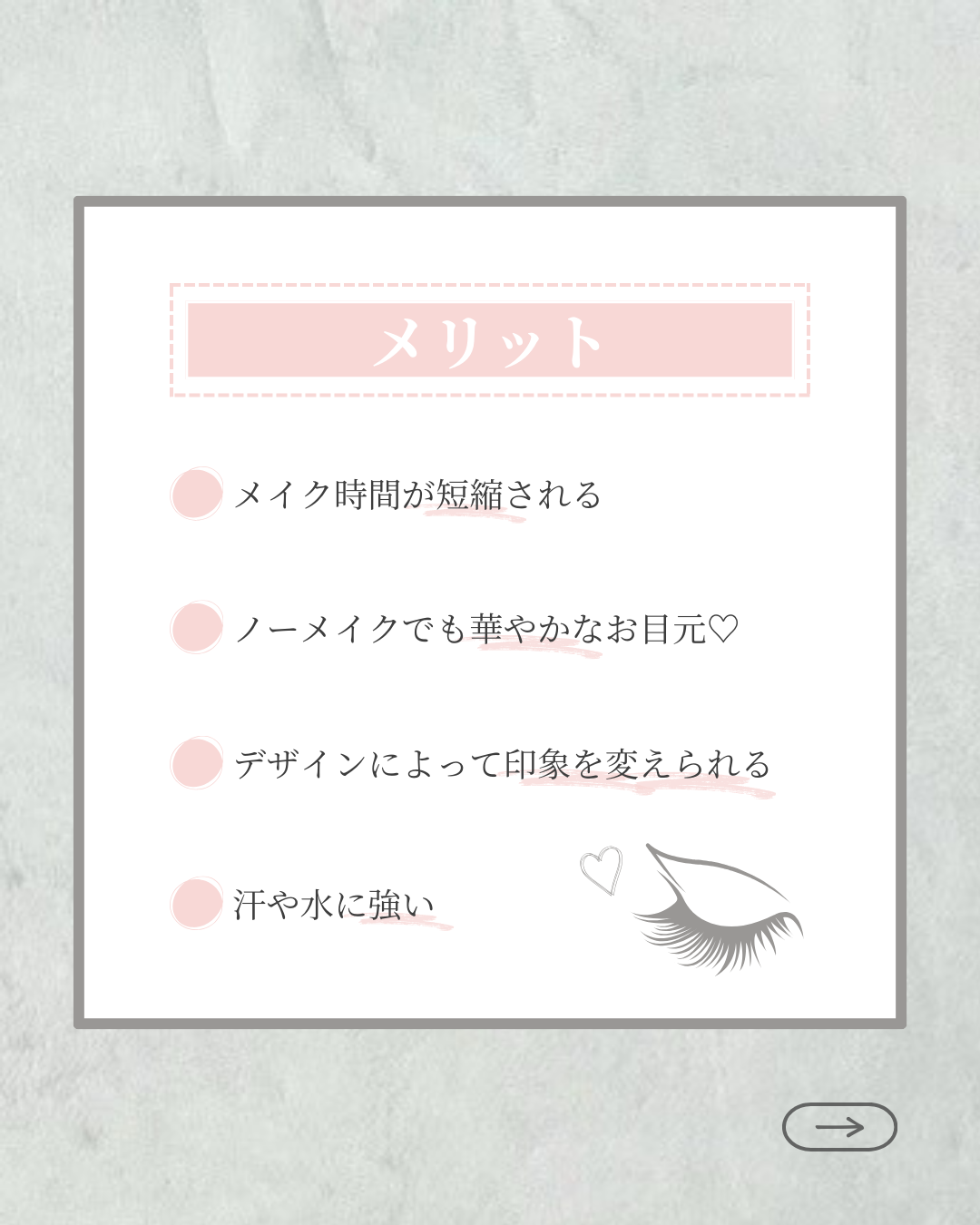 →「メリット=good」といった明るい要素が入っているため、「マツエク=まつ毛」のように関連性の高いグラフィックを配置することで、イコール性を設けた。