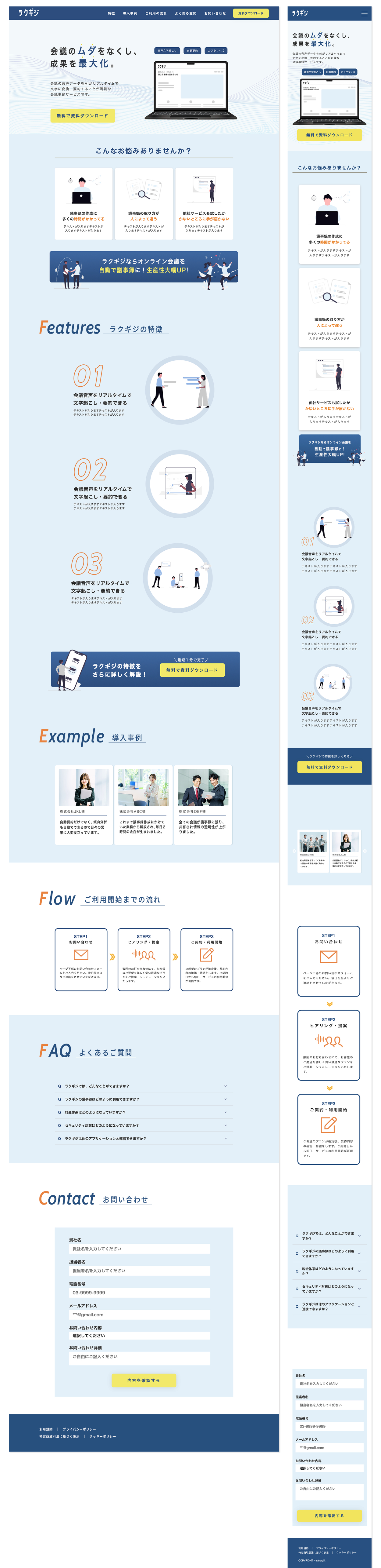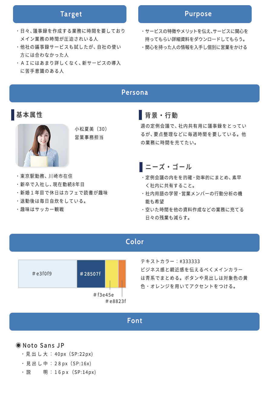 WEBデザインスクールの課題にてAI議事録サービスの LPを制作しました。 要件定義を元にした情報設計・ペルソナの設定・デザインカンプ作成・コーディングまで行いました。 [ 制作年:2025年1月 制作期間:1ヶ月 使用ツール:Photoshop / HTML&CSS]