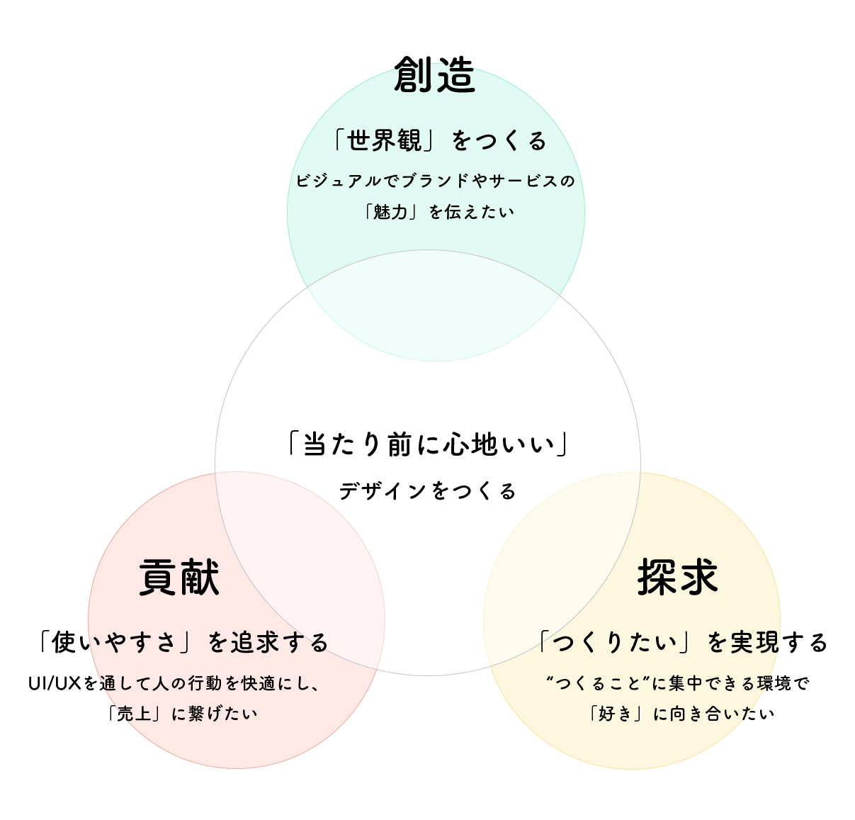 私にとって「『当たり前に心地いい』デザインをつくりたい」という想いは、「創造」「探求」「貢献」の3つの柱に支えられています。