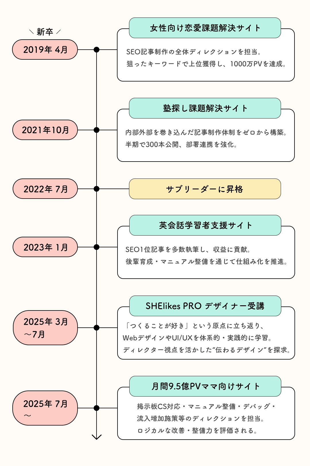 Webディレクターとして6年間、サイト運用やSEO施策を推進してきた経験から、チームでの連携や課題解決を重視してきました。