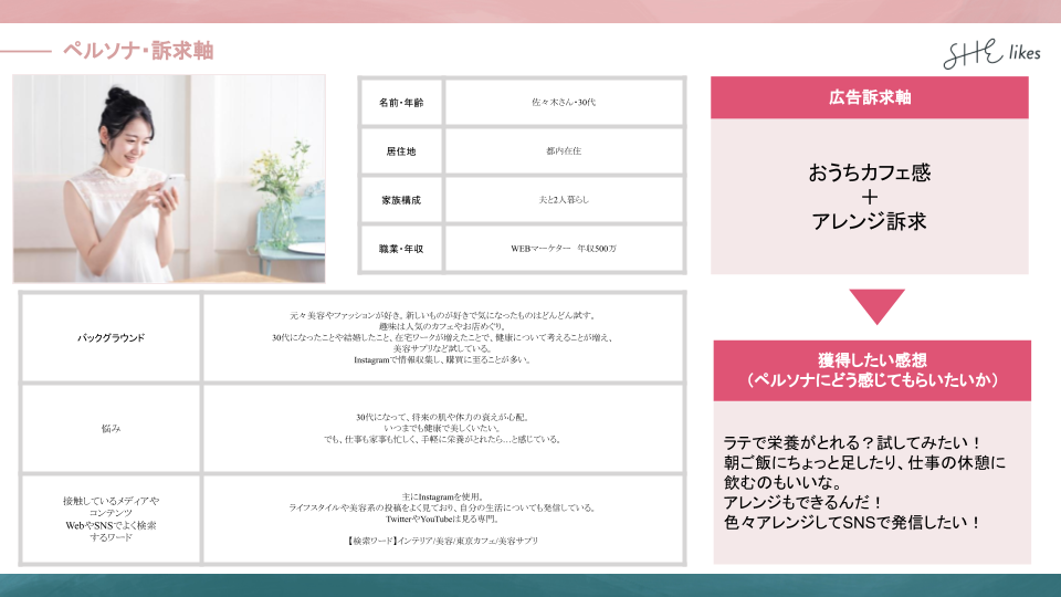 ・ラテ感覚で手軽に栄養が取れること、アレンジが楽しめることを訴求しました。