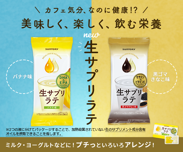 サントリー様の新商品「生サプリラテ」について、ペルソナ・訴求軸を考え、それに基づいてバナー作成をいたしました。