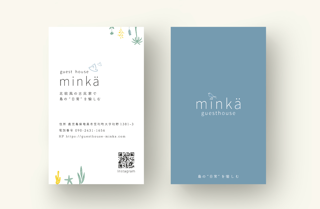 奄美大島に移住してきたご夫婦が、DIYで古民家を改装して造った北欧風のゲストハウス「minkä様」開業に際して、ショップカードを制作させていただきました。
