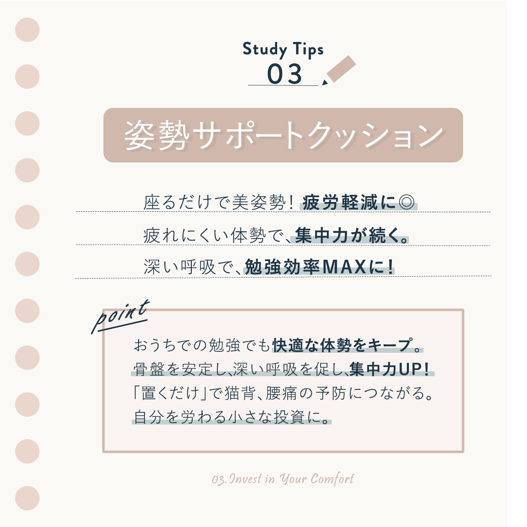 ⓷クッション…姿勢で集中力を維持、快適さへの投資