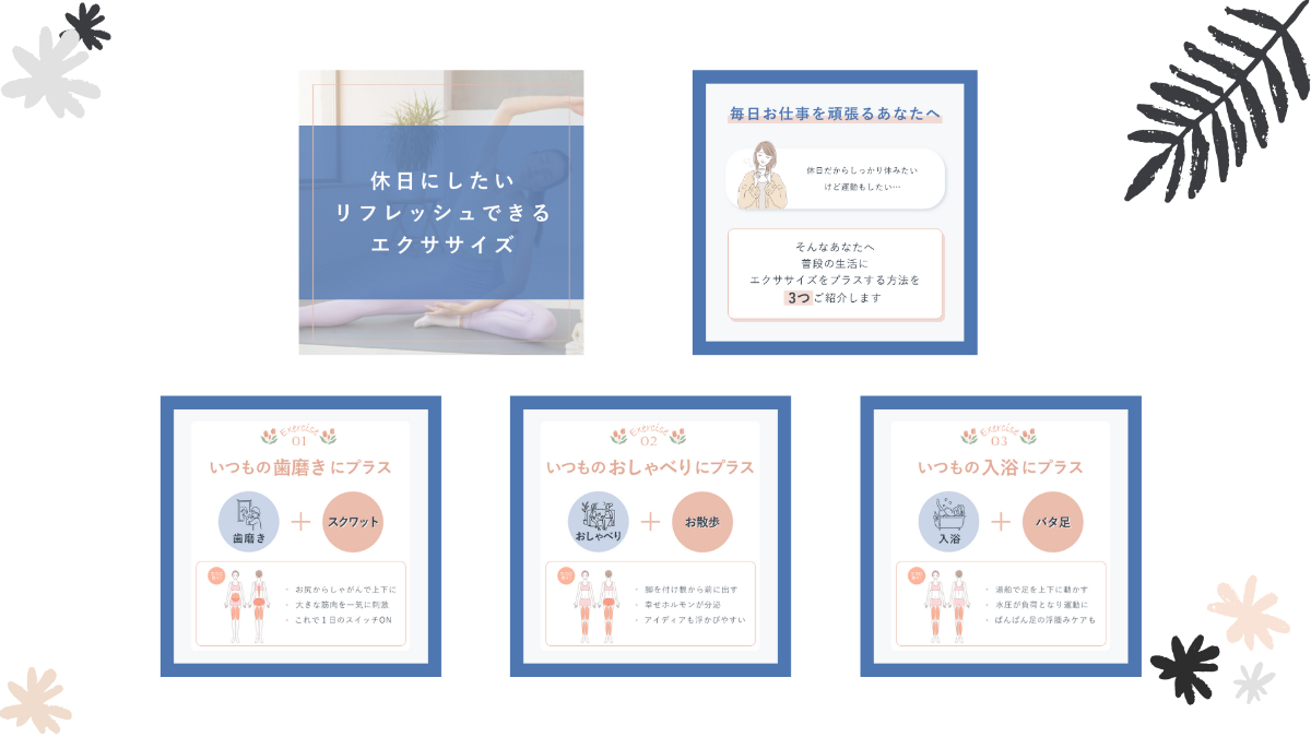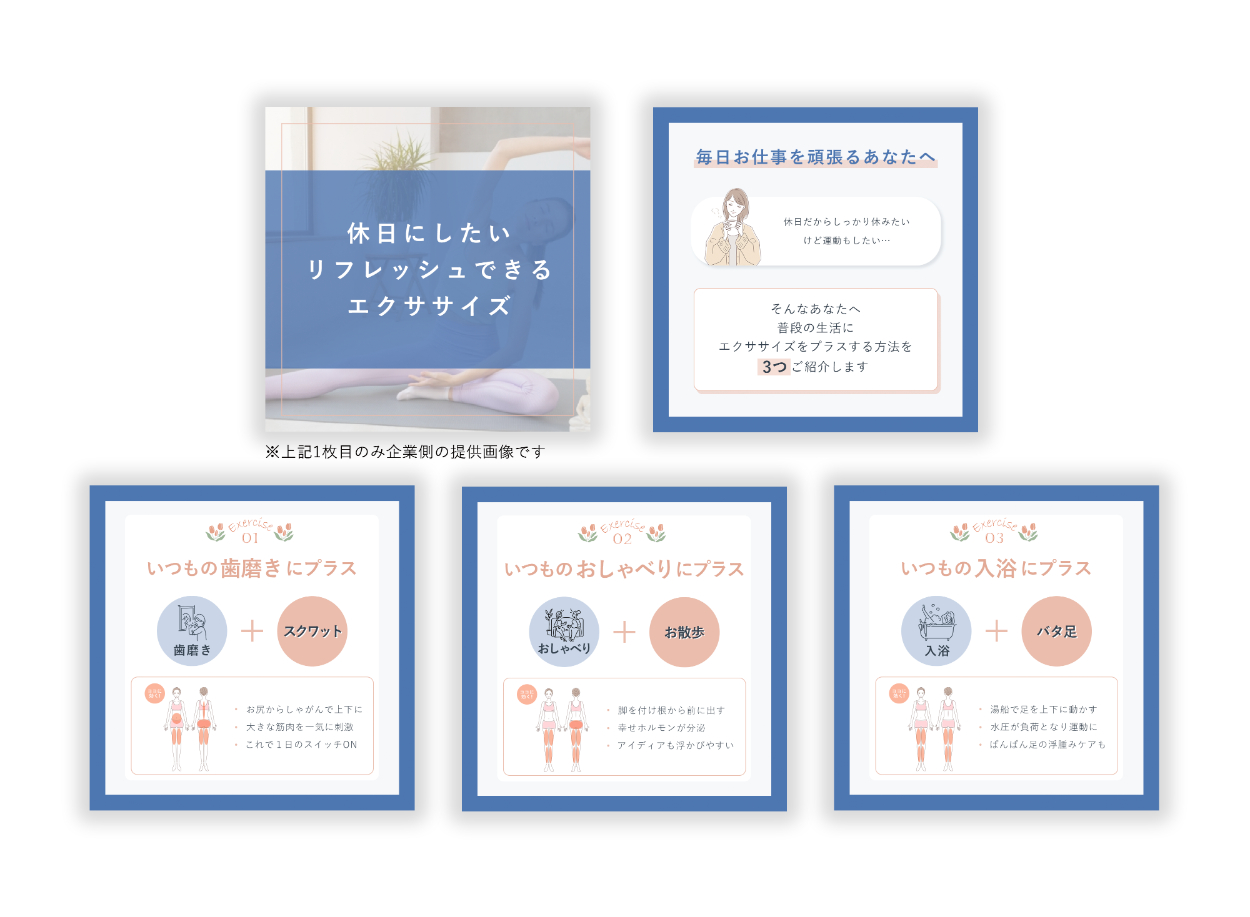 →忙しい一方でなにから始めたらいいかわからないというターゲットを想定し、「ながら」でできるような、ハードルを下げたエクササイズに統一して表現しました。