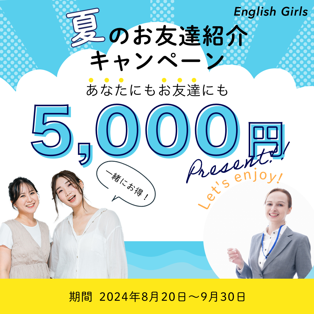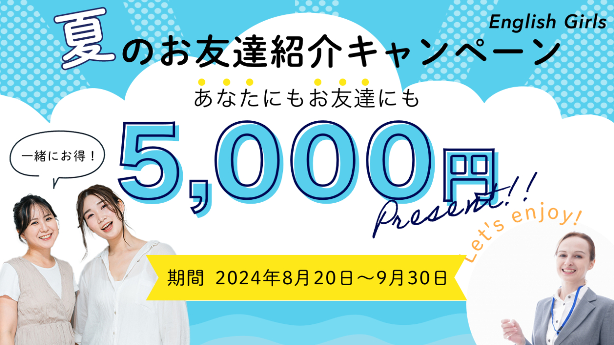 ①一緒にお得!②夏のお友達紹介キャンペーン③あなたにもお友達にも5,000円プレゼント ④期間:2024年8月20日~9月30日