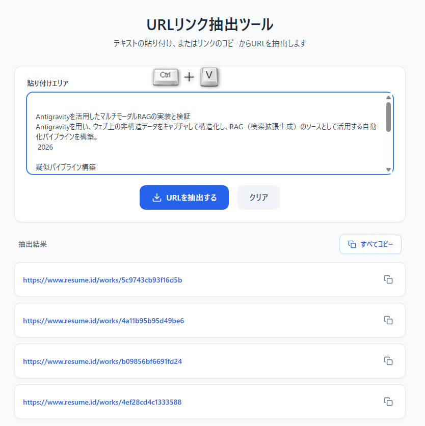日常的なリサーチ業務で発生する「ブラウザ上の大量のテキストからURLのみを抽出する」という定型作業を自動化するために開発。Gemini(LLM)をコーディングパートナーとして活用し、要件定義から実装、デバッグまでを短期間で完結させたマイクロユーティリティです。