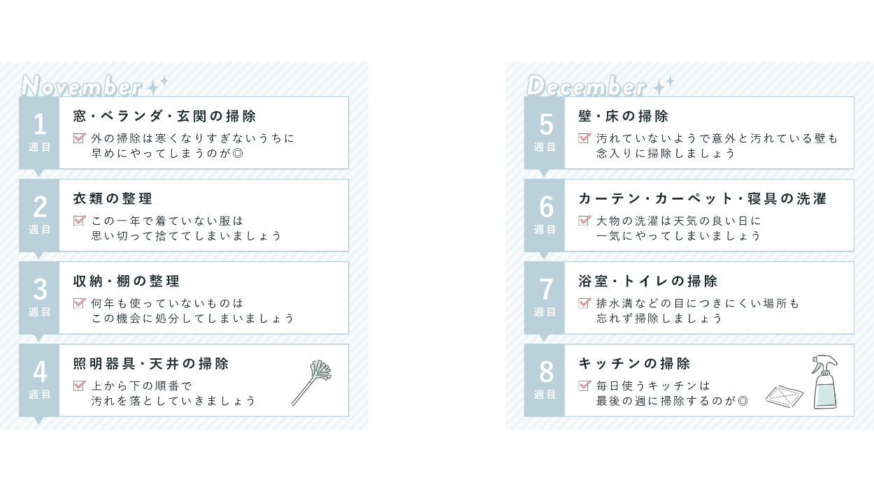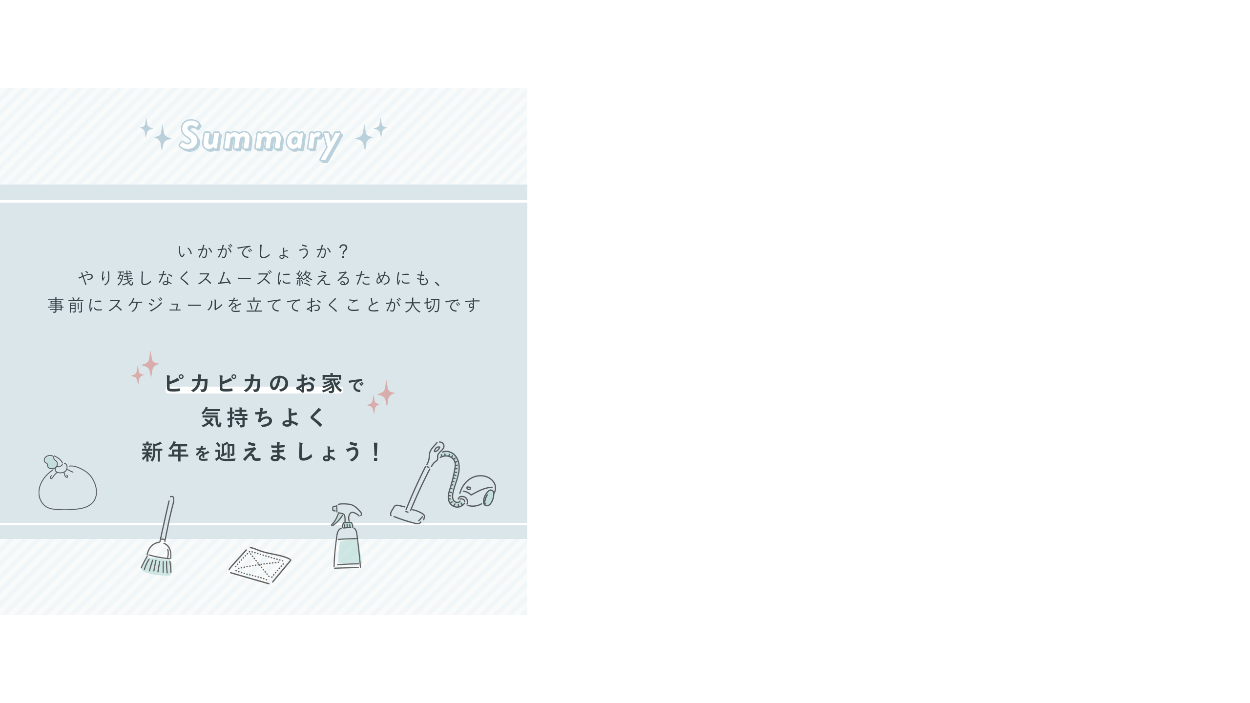 実際に自分が毎年行っている大掃除スケジュールを、簡潔にわかりやすくまとめました。