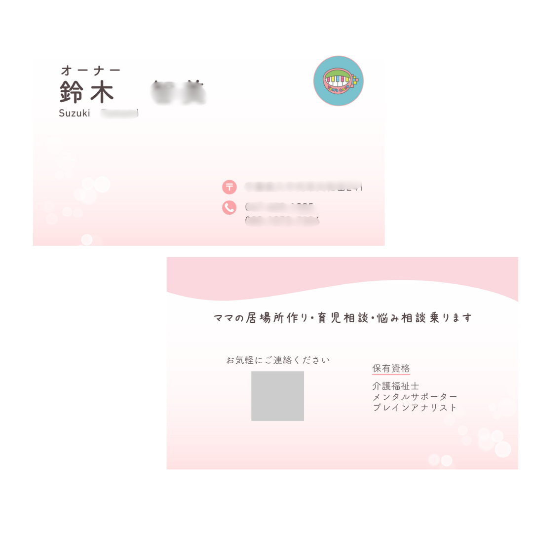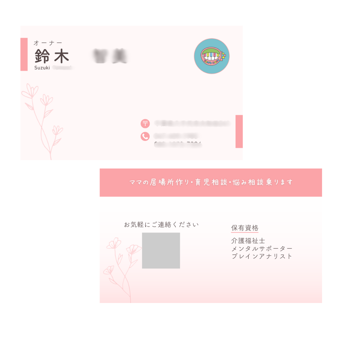 【鈴木様】名刺作成 miki design webデザイナー OVERVIEW 鈴木様の名刺を作成しました。tool:illustration YEAR 2025 cafeのオーナー様の名刺を作成しました。子どもやママ向けの活動を行っているので、柔らかい印象にしました。裏ののれんはお店のcafeのイメージに合わせました。【他の案】制作日数:3日間tool:illustration