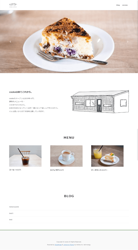 カフェcooks kana web制作&デザイン ・WordPressのテーマ(Lightning)を使用・レスポンシブ対応・サイトで使用しているLightningは無料テーマなので、費用を抑えたい方におすすめ