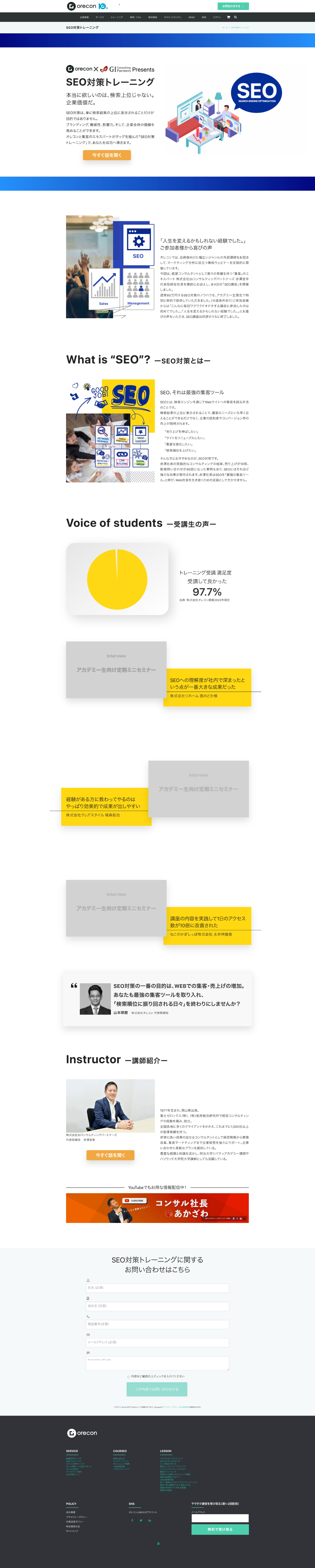 SEO講座LP Takamitsu Uchikoshi Webデザイナー/フロントエンジニア/Webデベロッパー OVERVIEW 株式会社オレコンが運営するSEO対策トレーニングのランディングページのデザイン/コーディングを担当しました。 YEAR 2022 WEBSITE