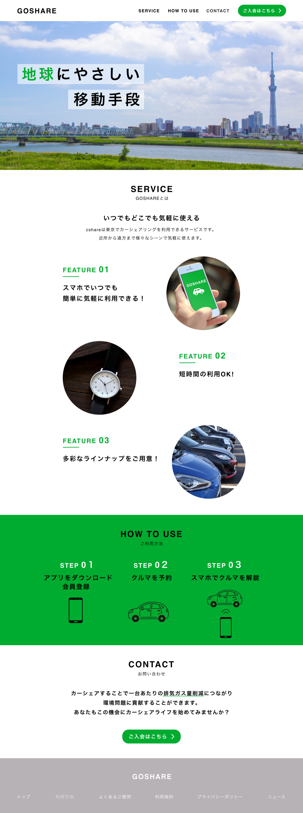 工夫した点:ファーストビューではカーシェアリングは環境に優しいクリーンなサービスであることをターゲットに視覚的に訴えるために東京の美しい自然の写真を採用し、「地球に優しい移動手段」という言葉を入れました。