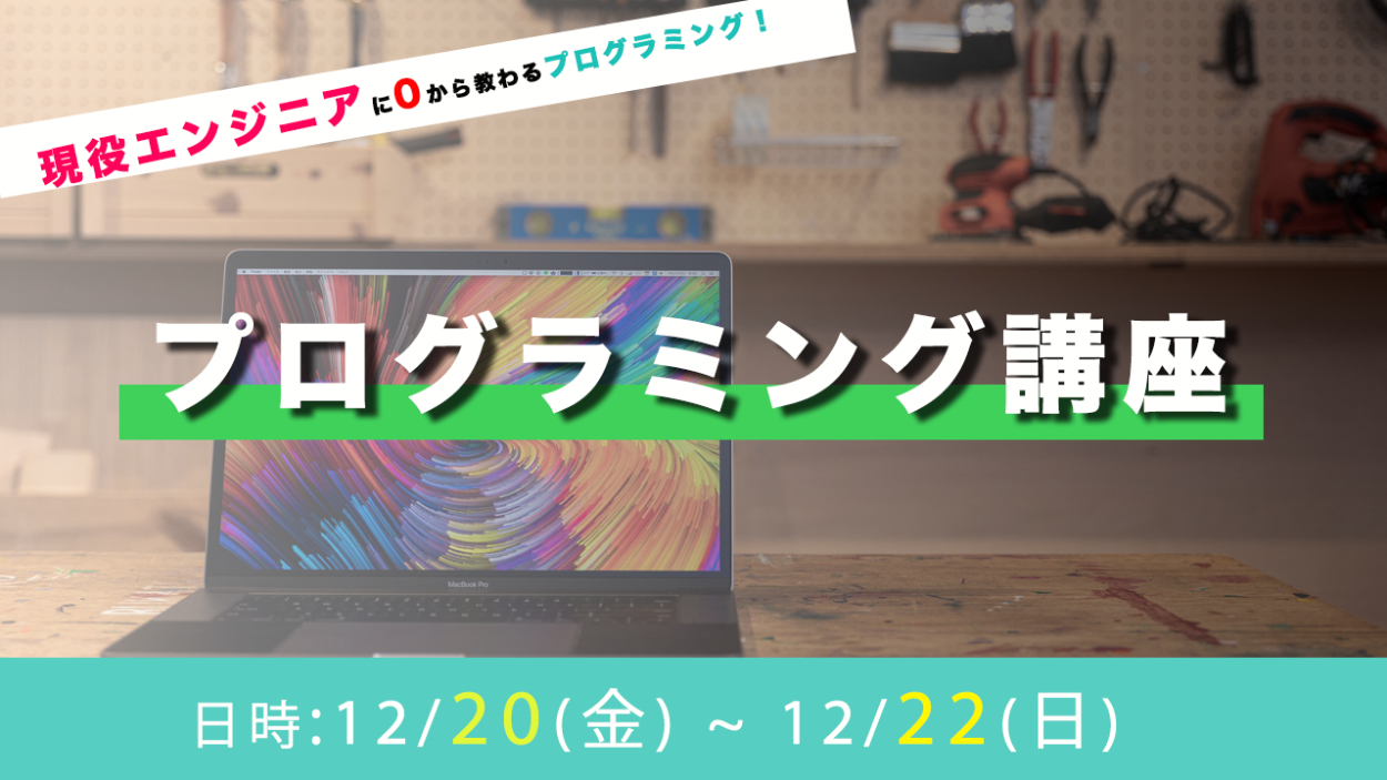「現役エンジニア」「0から」「プログラミング」などのおすすめポイントや、日時などの情報がアイキャッチ画像だけで伝わるようにデザインしました。
